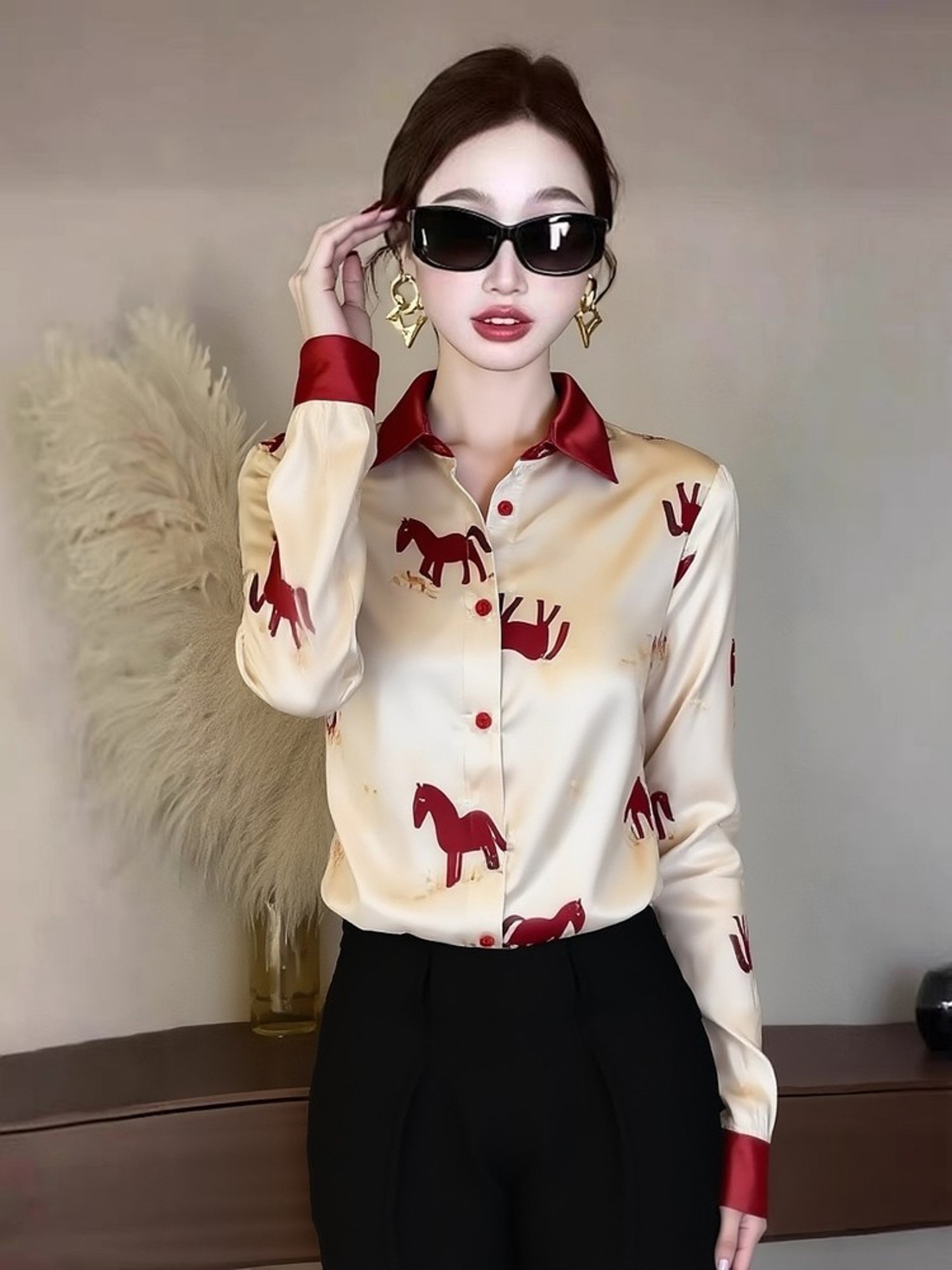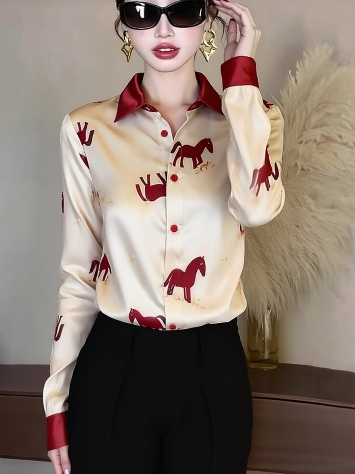 FA55010# 香槟色印花衬衫女新款春高级感轻奢减龄洋气职业法式小资上衣 服裝批發女裝批發服飾貨源