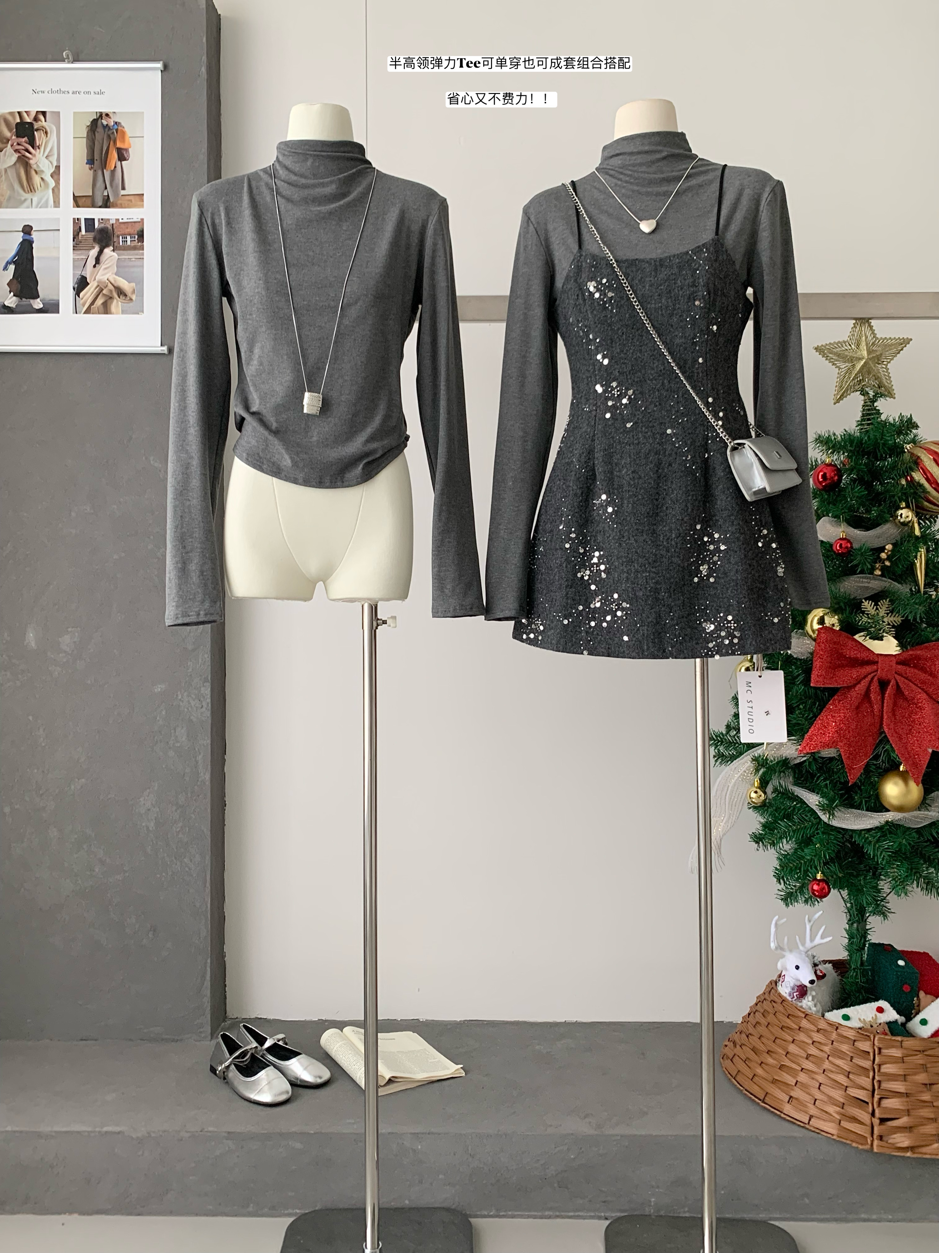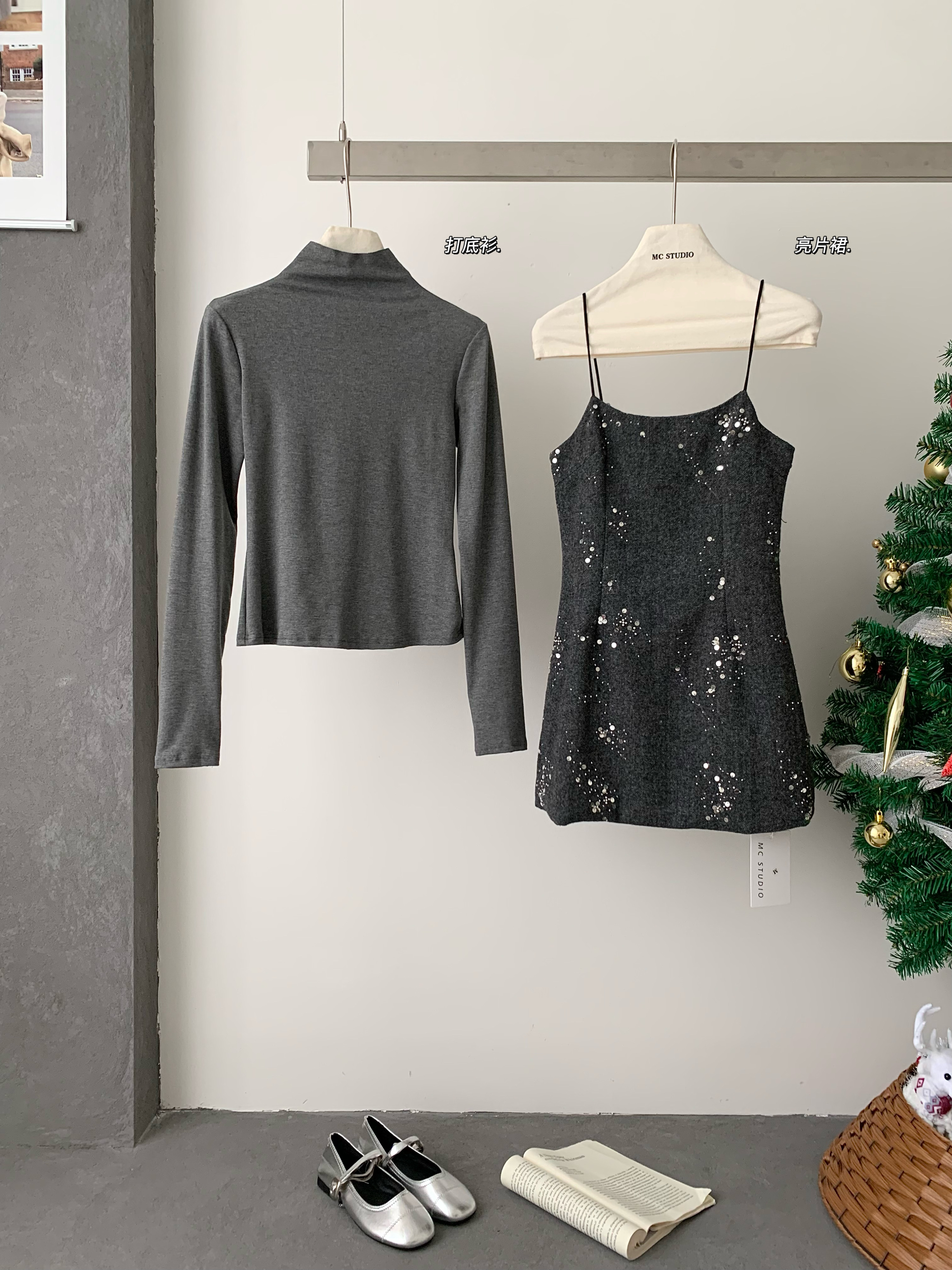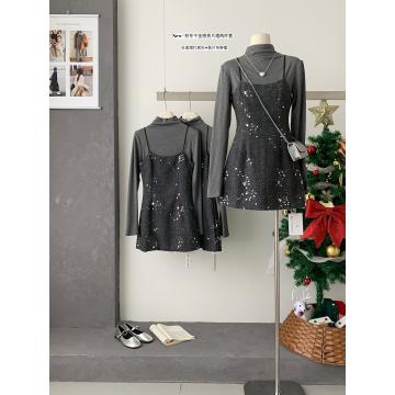 FA55013# 韩系气质吊带裙亮片吊带连衣裙+半高领打底长袖T恤两件套套装 服裝批發女裝批發服飾貨源