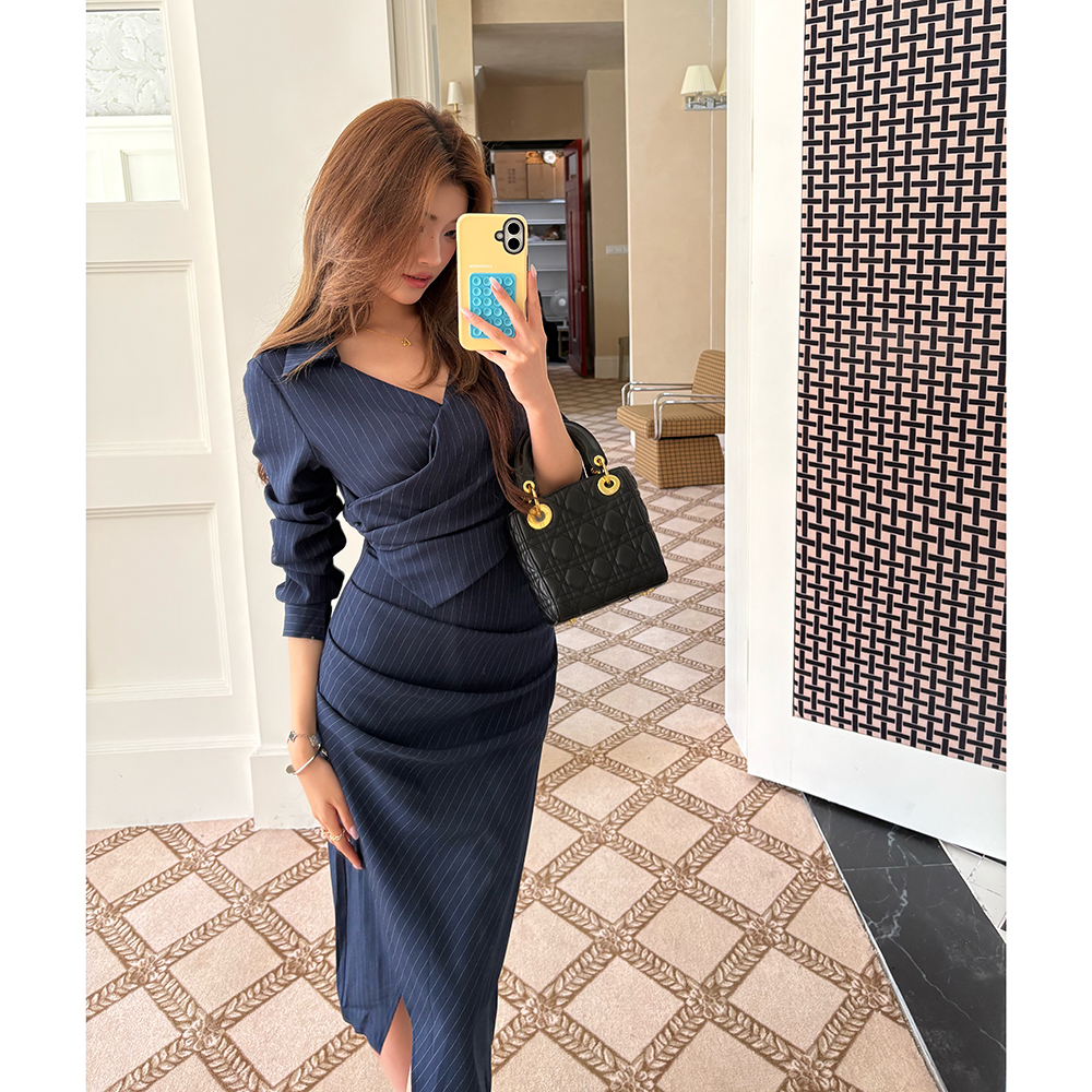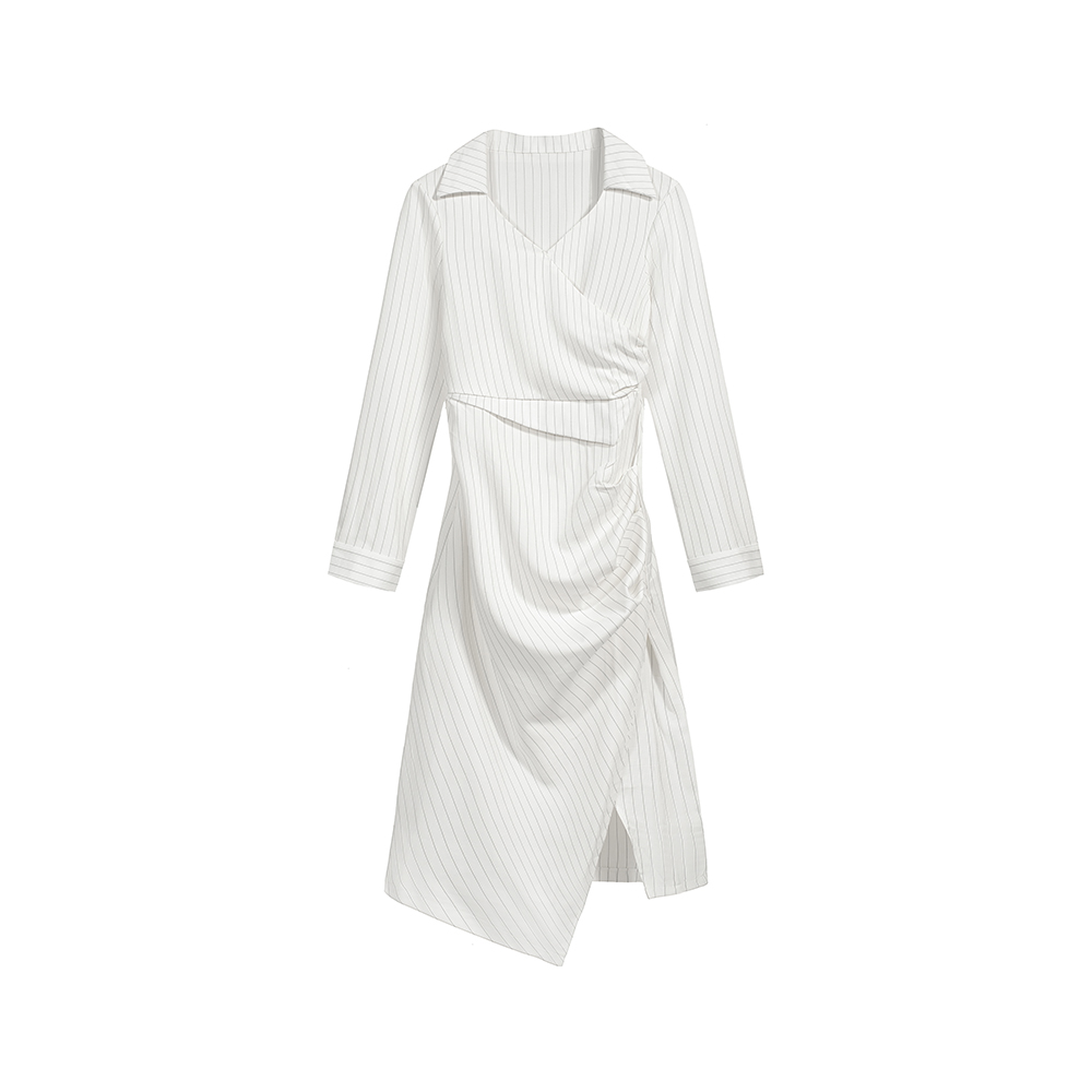 FA55019# 春装新款设计气质职场海妖风条纹长袖连衣裙女御姐衬衫裙 服裝批發女裝批發服飾貨源