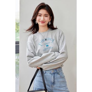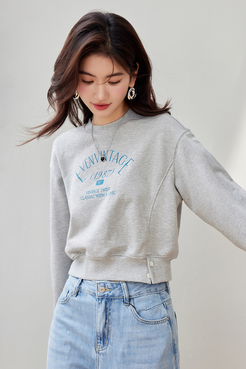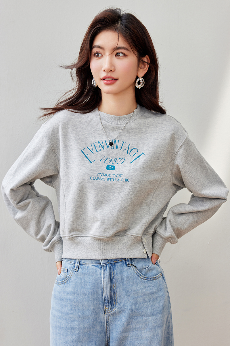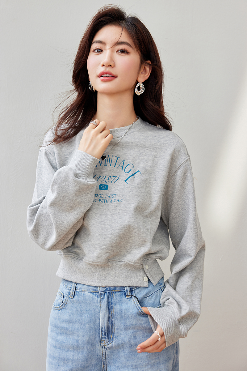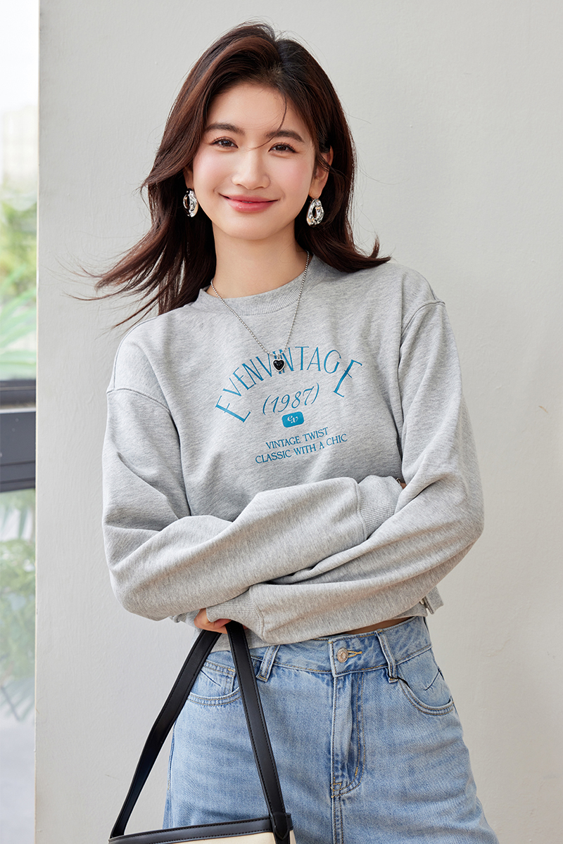 FA55040# 春款印花简约设计感短款圆领套头上袖卫衣 服裝批發女裝批發服飾貨源