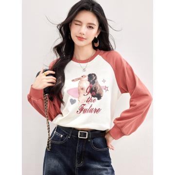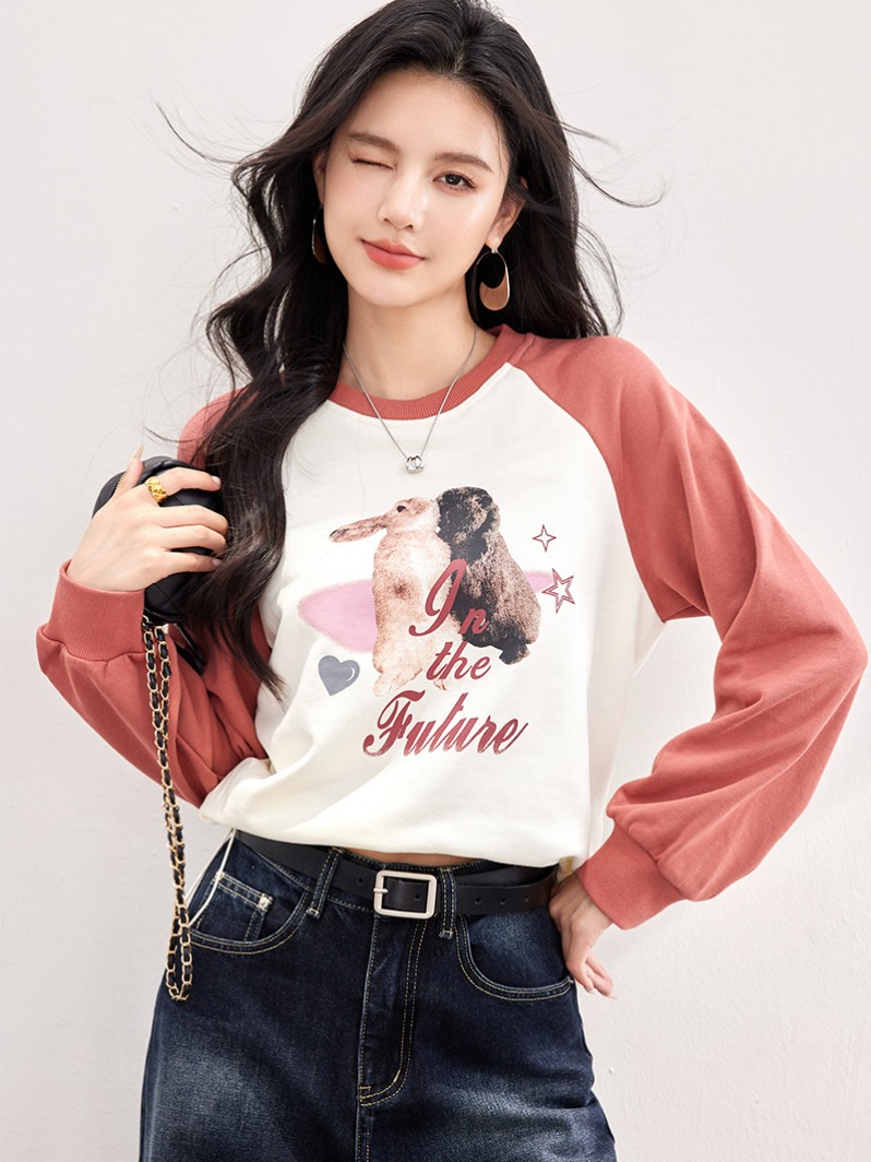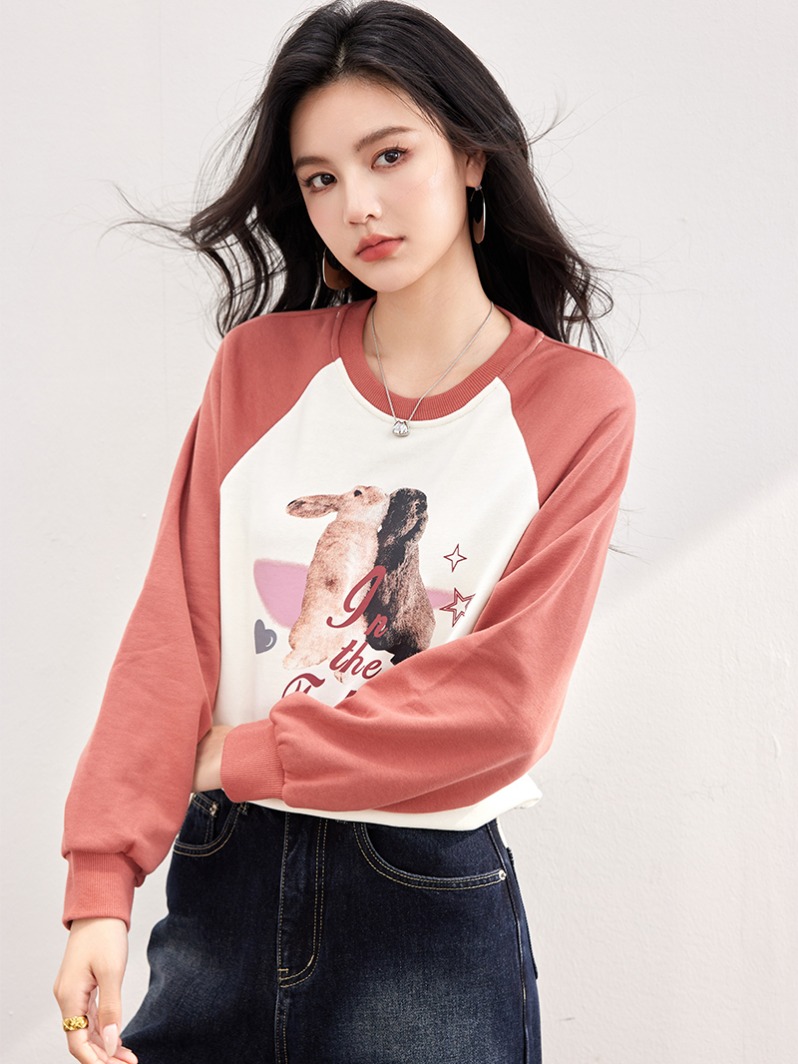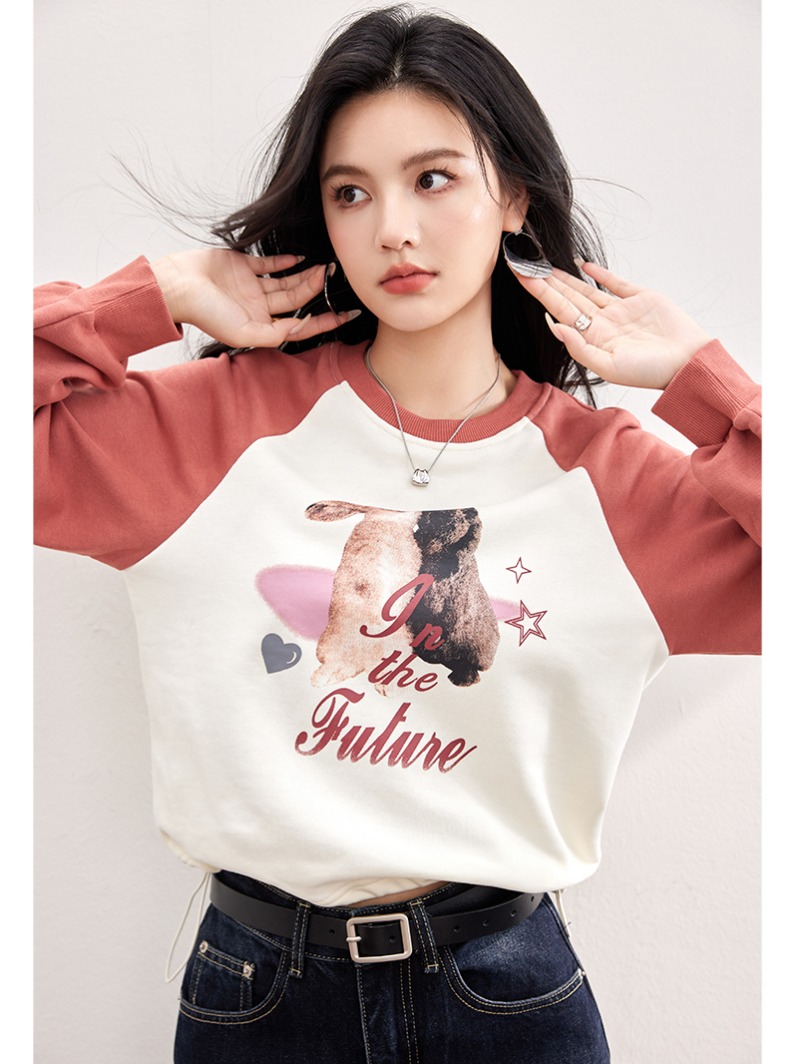 FA55044# 春款兔子图案复古插肩长袖设计感抽绳拼色卫衣 服裝批發女裝批發服飾貨源