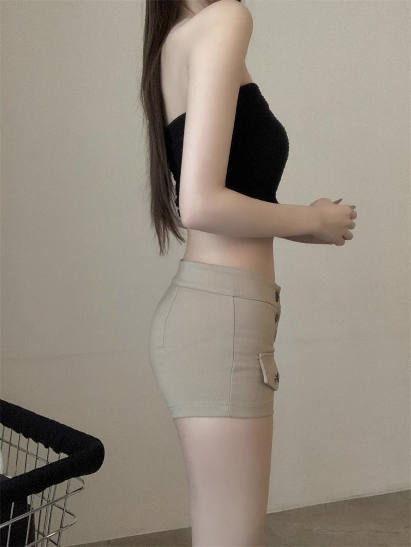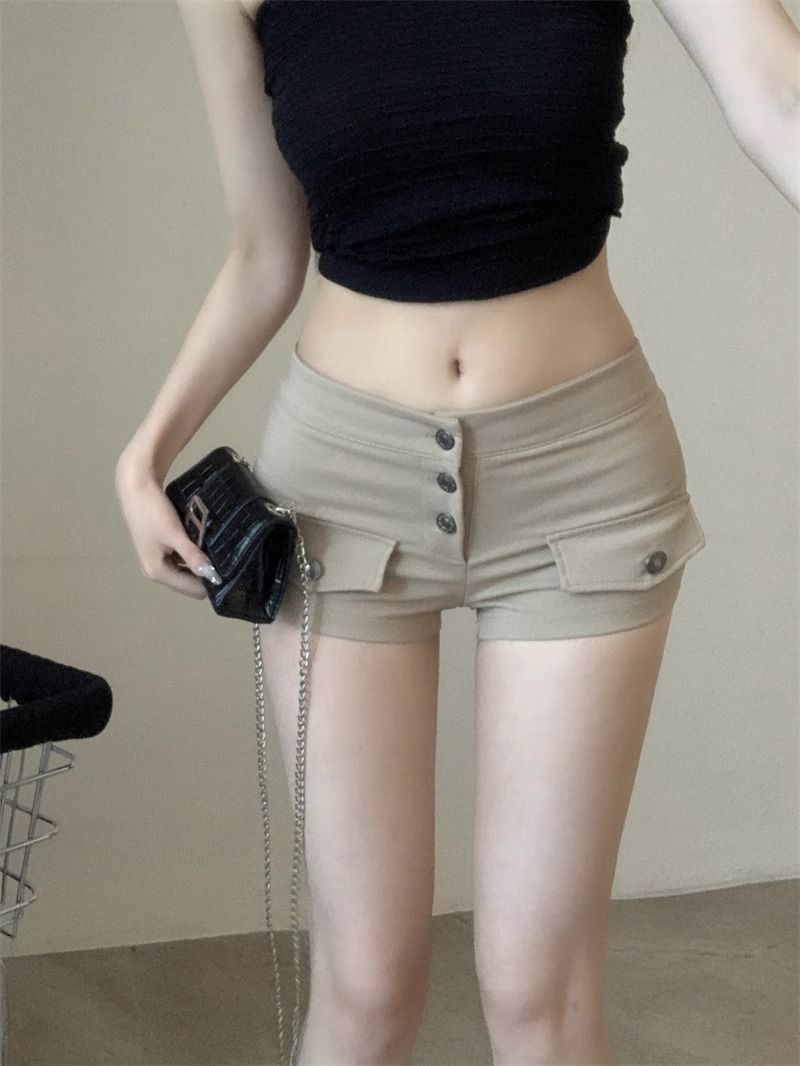FA55049# 美式辣妹复古卡其色牛仔裤女夏季口袋设计感热裤修身显瘦包臀短裤 服裝批發女裝批發服飾貨源