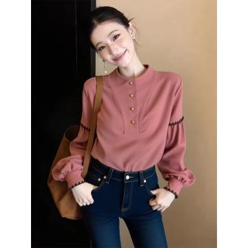 FA55079# 法式粉色金扣灯笼长袖衬衫女秋冬宽松显瘦洋气设计感复古气质上衣 服裝批發女裝批發服飾貨源