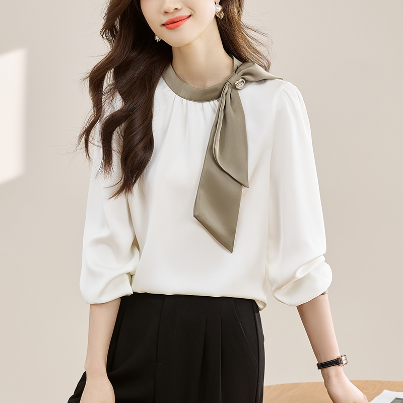 FA55082# 法式温柔领口蝴蝶结衬衫女装春秋新款拼色飘带设计感缎面上衣 服裝批發女裝批發服飾貨源