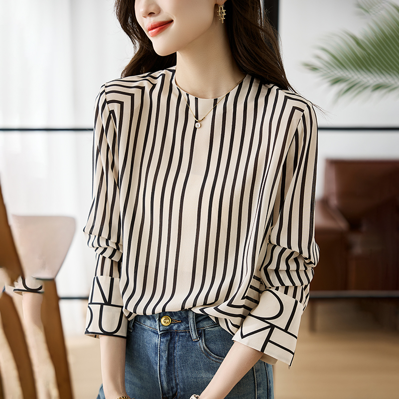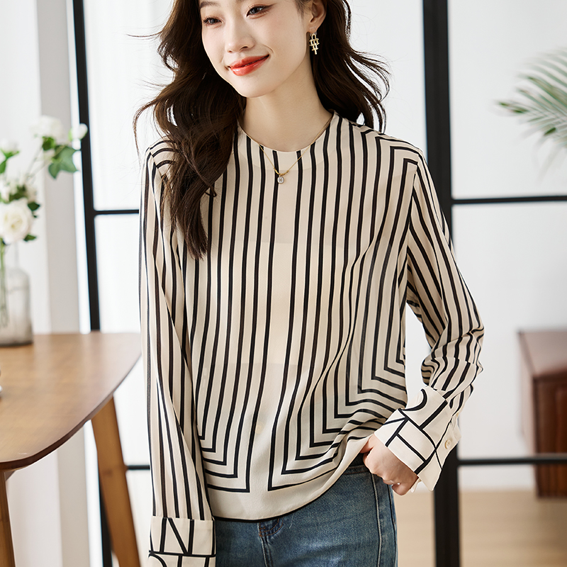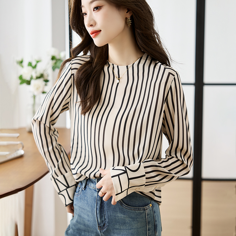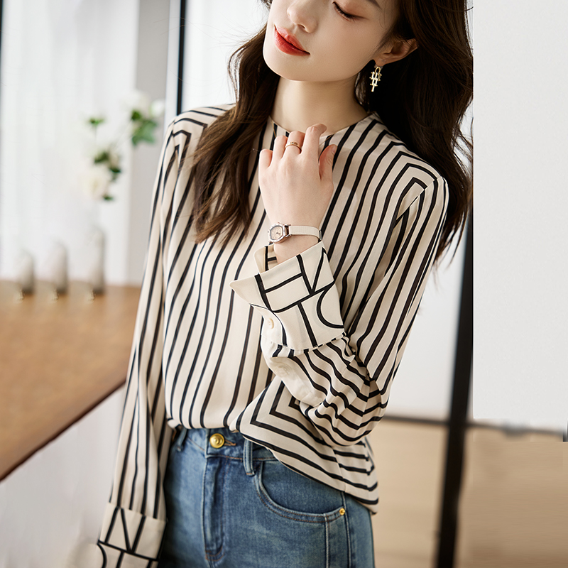 FA55083# 法式高端黑白条纹气质圆领衬衫女设计感春秋新款上衣 服裝批發女裝批發服飾貨源