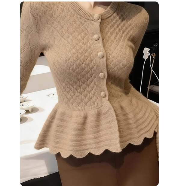 FA55114# 巨好看卡其色荷叶边针织开衫女新款秋季掐腰显身材外穿上衣 服裝批發女裝批發服飾貨源
