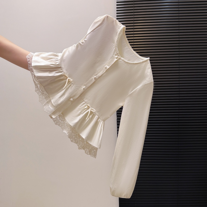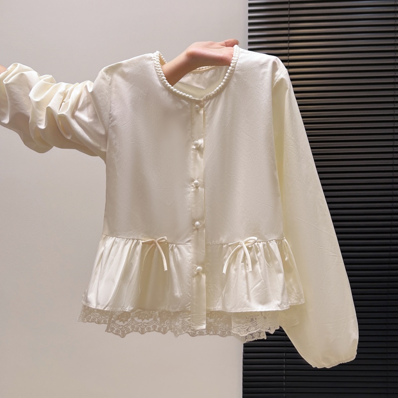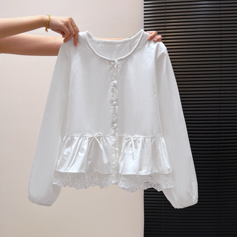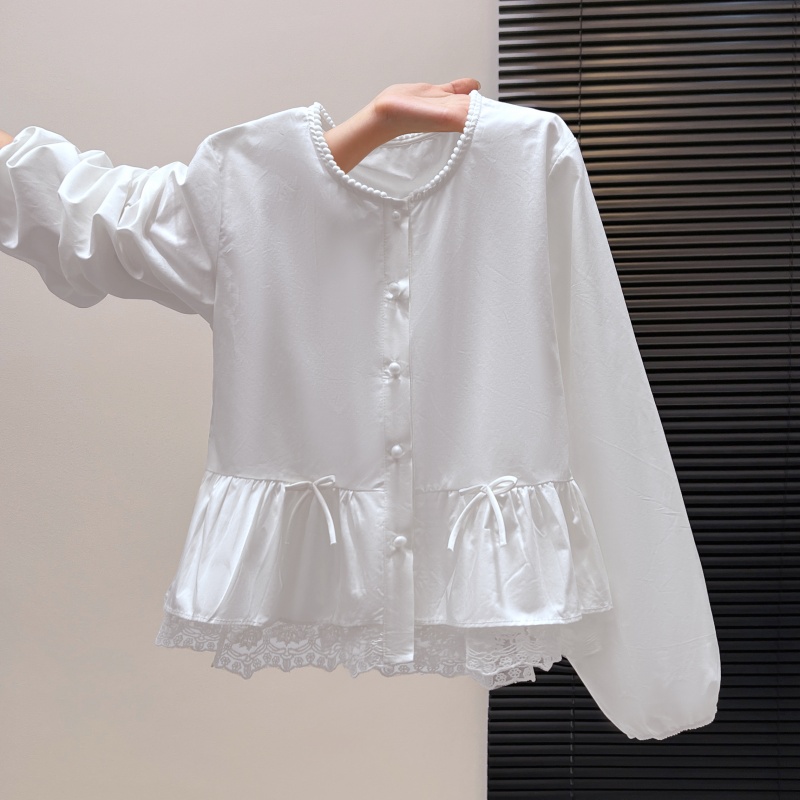 FA55151# 甜美蕾丝花边圆领长袖衬衫女春季新款荷叶边裙摆蕾丝上衣 服裝批發女裝批發服飾貨源
