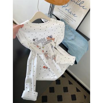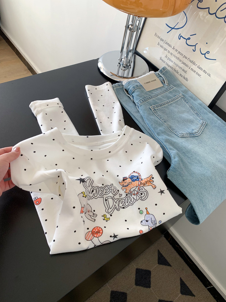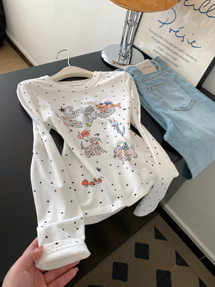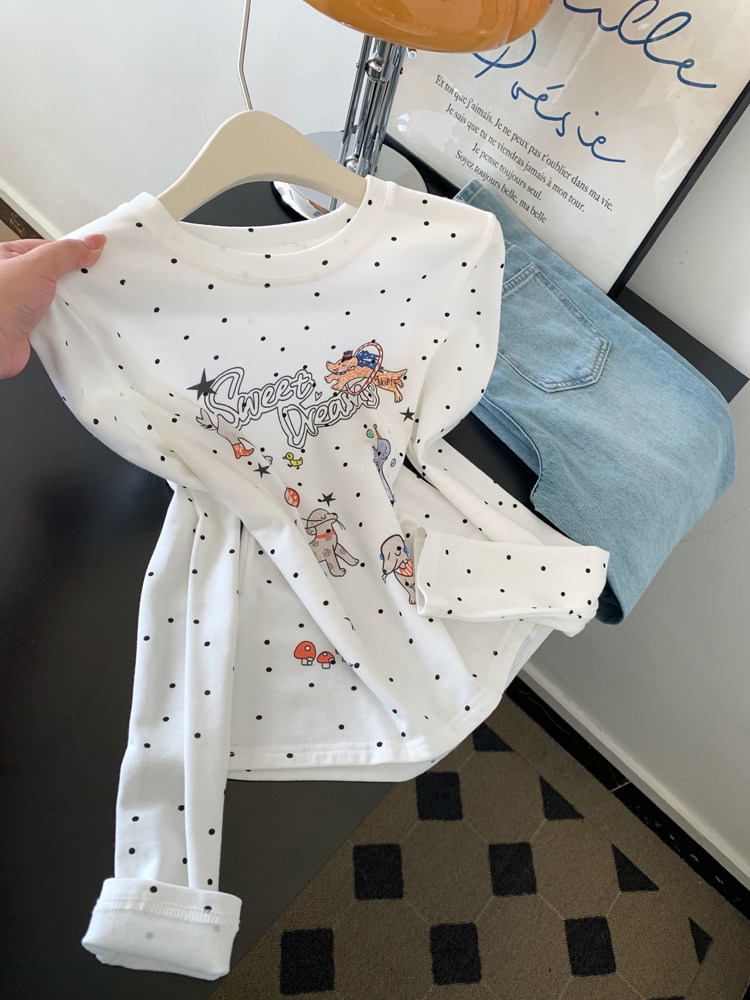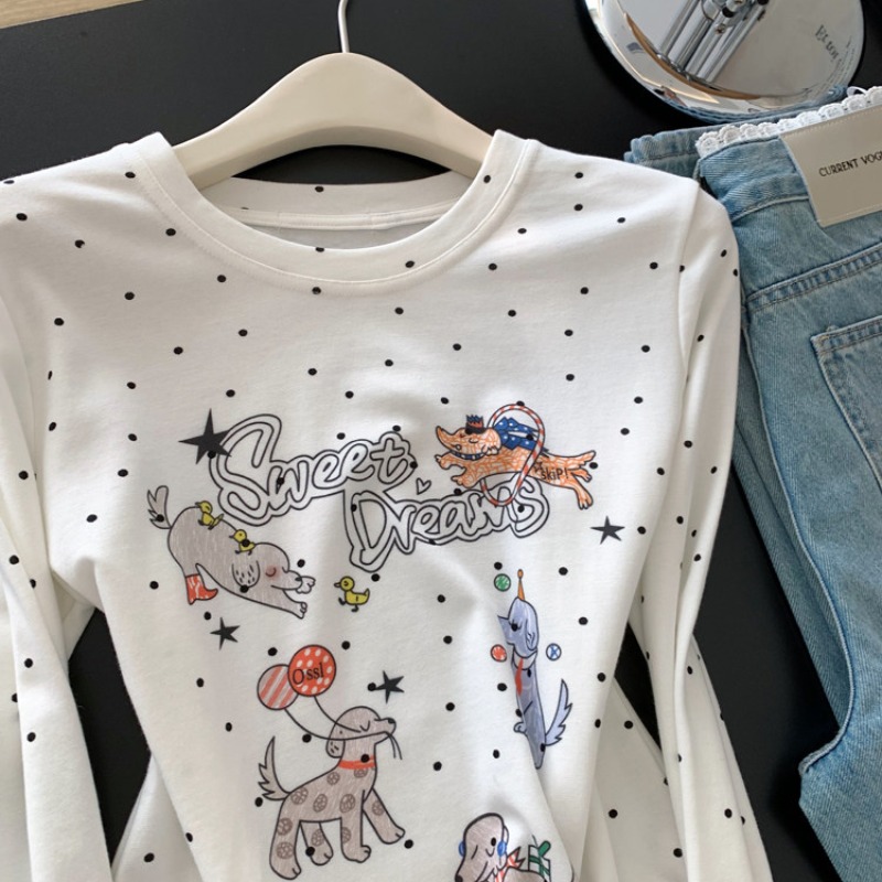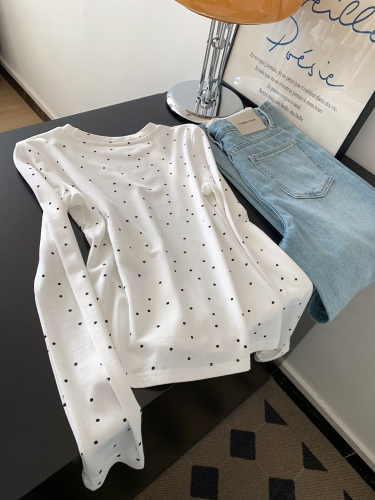 FA56233# 白色波点印花长袖t恤女短款绝美漂亮正肩小上衣新款 服裝批發女裝批發服飾貨源