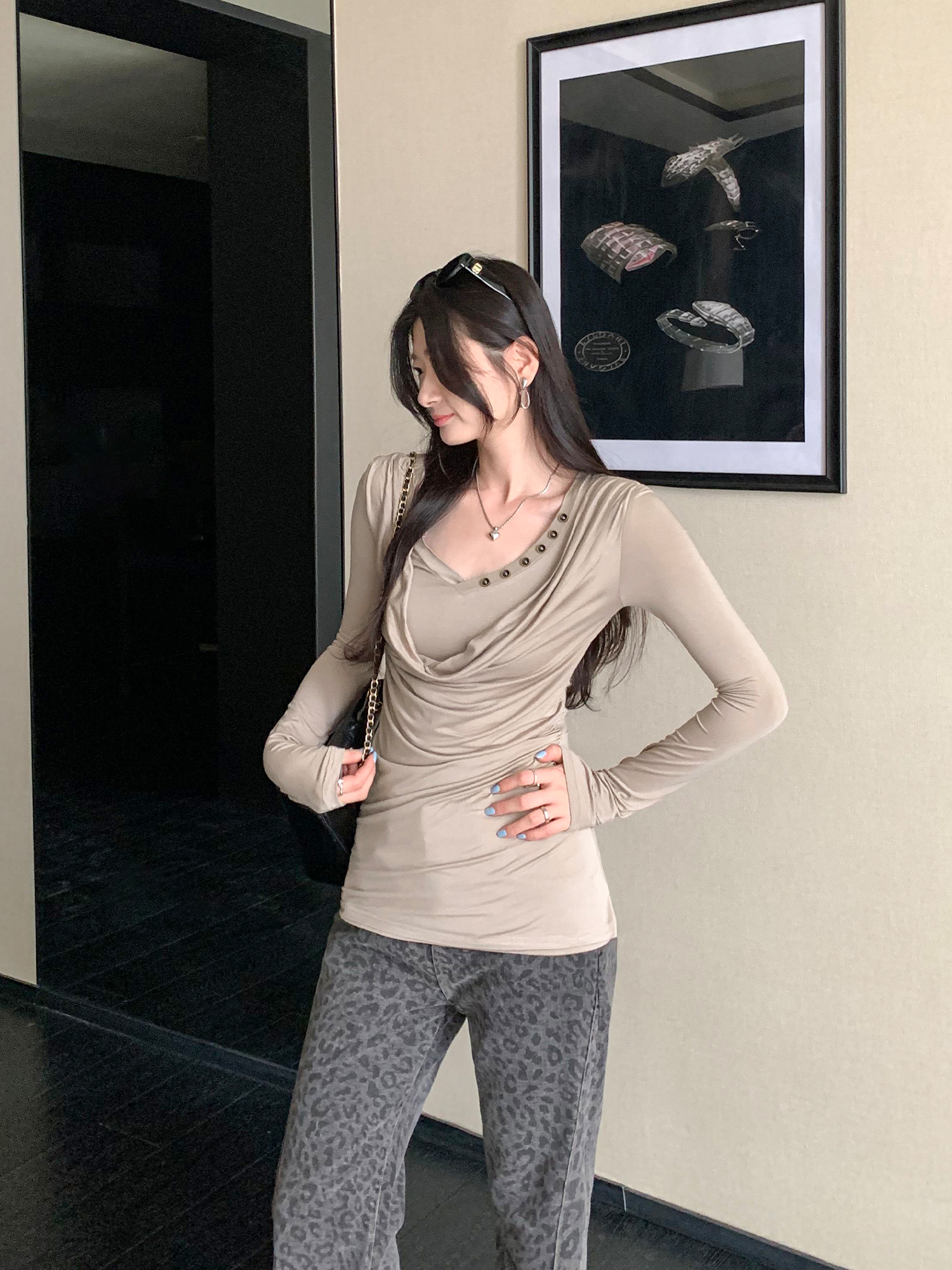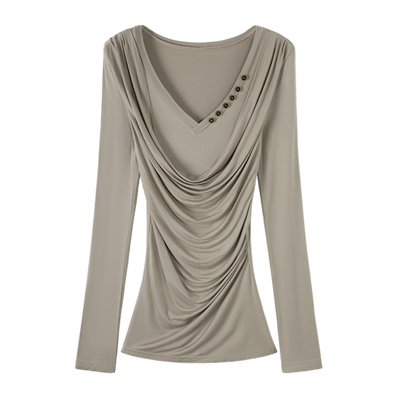 BY10305# 韩系V领褶皱卡其色长袖T恤女春新款中长款超好看打底衫 服裝批發女裝批發服飾貨源