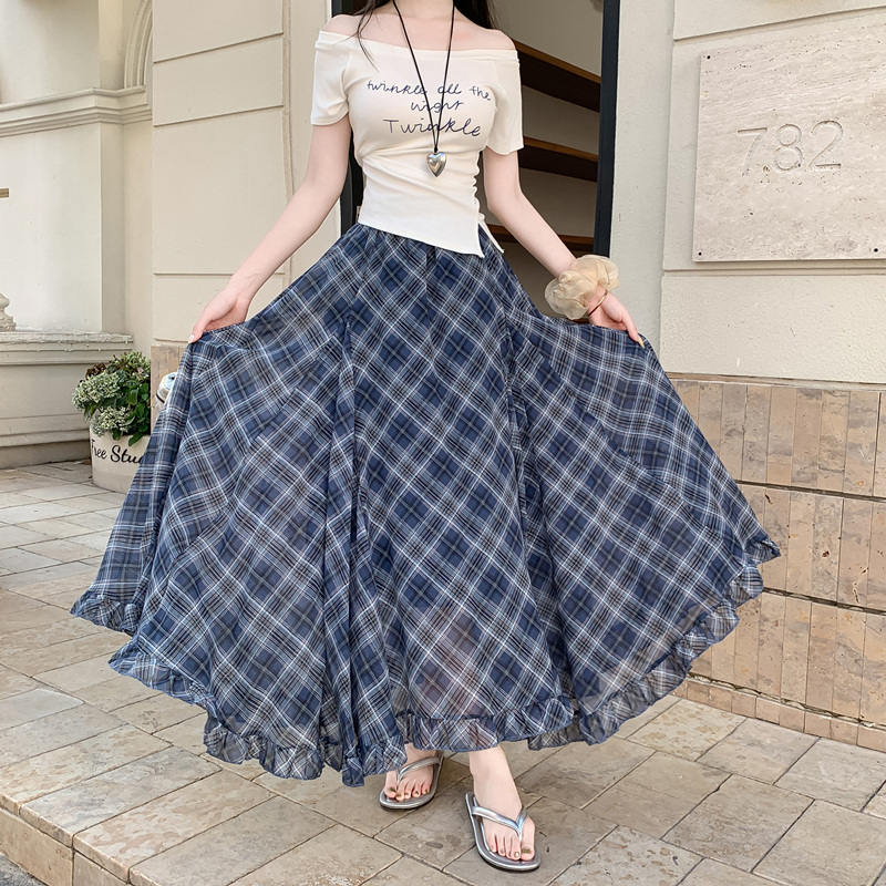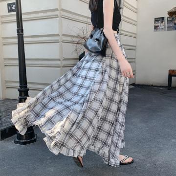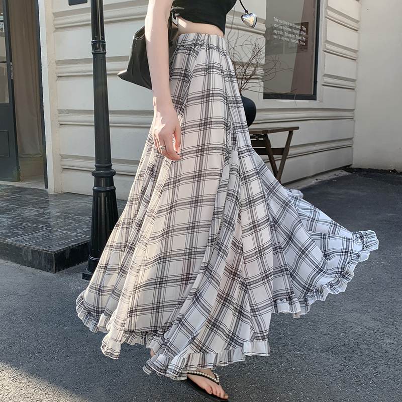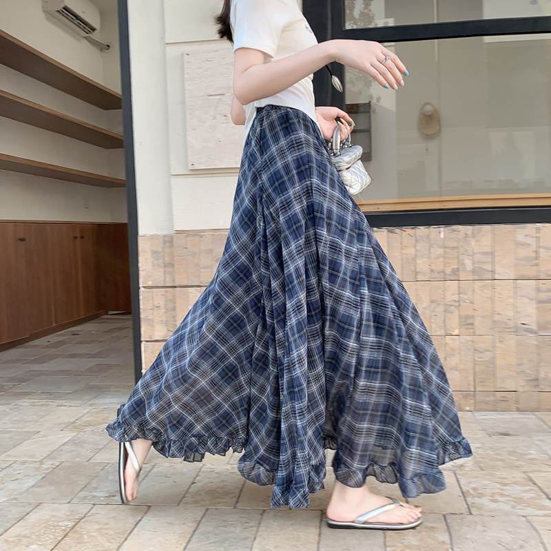 BY10333# 实片夏季新款复古红色格纹高腰不规则木耳边下摆中长雪纺长裙 服裝批發女裝批發服飾貨源