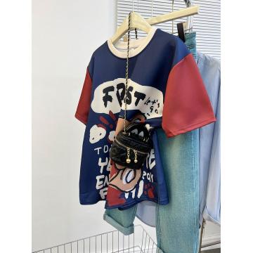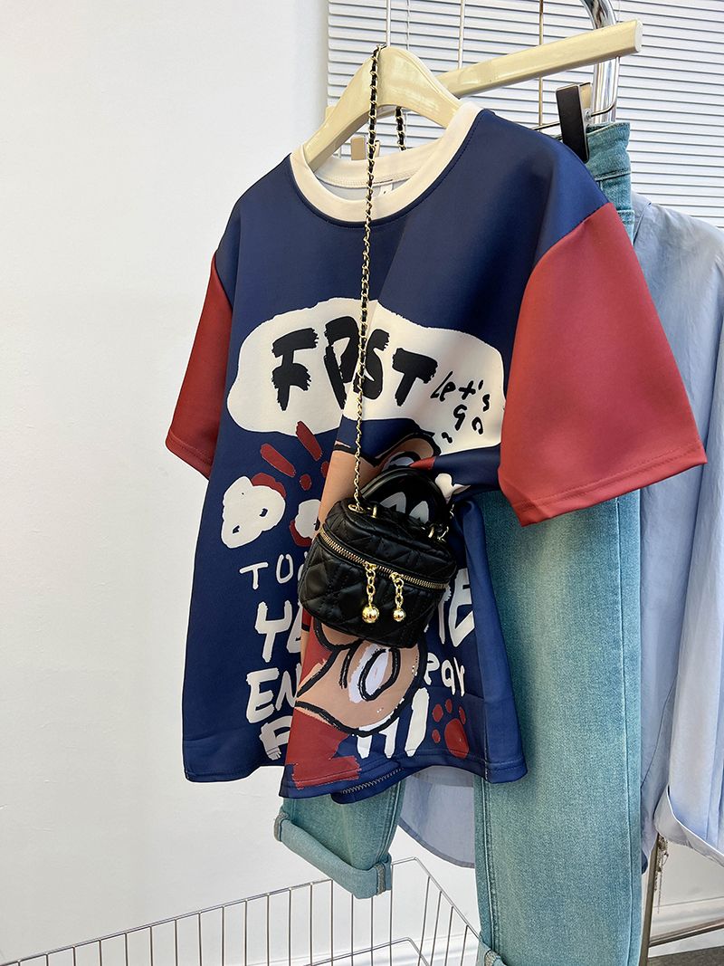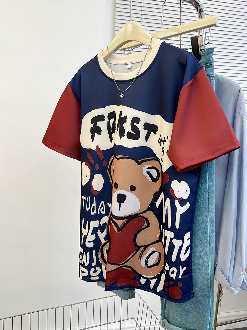 BY10354# 空气层中长款印花小熊拼色短袖t恤女大码200斤女装上衣 服裝批發女裝批發服飾貨源