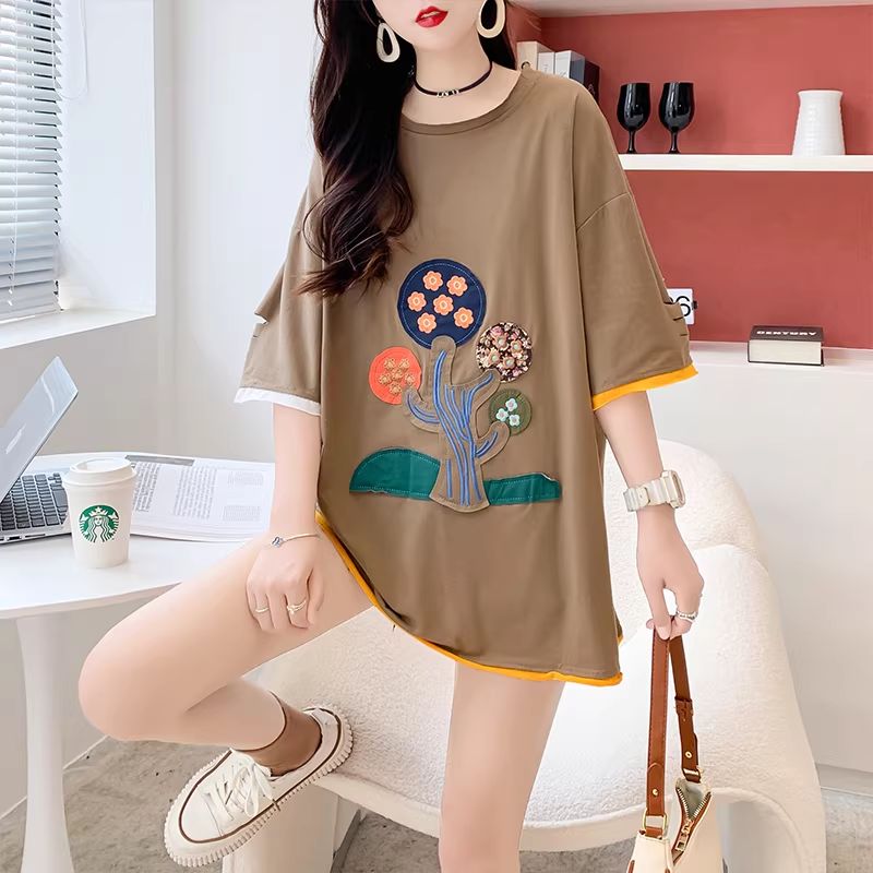 BY10355# 棉重工刺绣新款短袖t恤女大码女装胖mm上衣服 服裝批發女裝批發服飾貨源