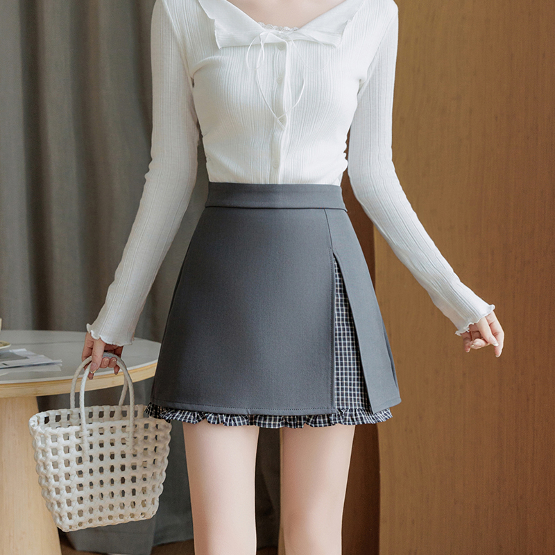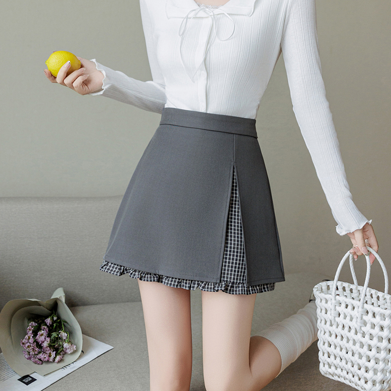 BY10367# 春夏新款不规则A字裙荷叶边防走光格子短裙韩版假两件半身裙 服裝批發女裝批發服飾貨源