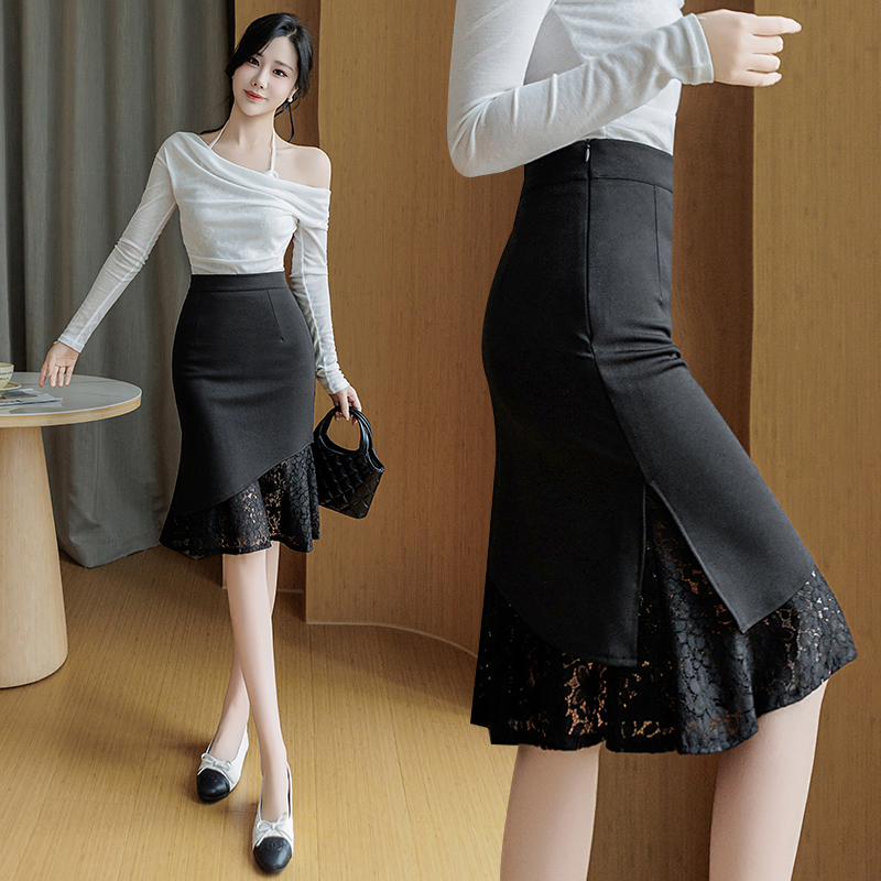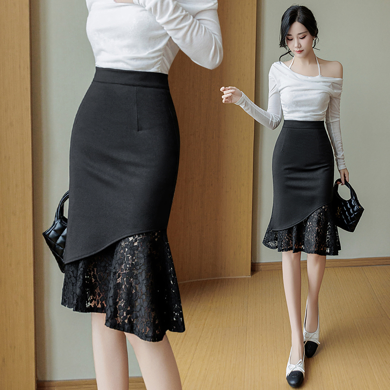 BY10368# 蕾丝拼接弹力半身裙女春夏新款OL职业裙不规则鱼尾包臀裙子潮 服裝批發女裝批發服飾貨源