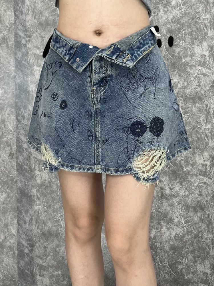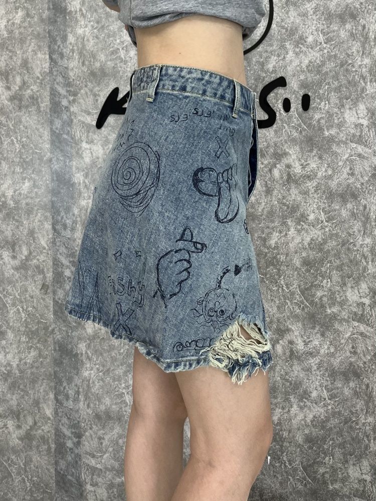BY10378# 高腰牛仔短裙女夏a字半身裙小个子小众设计感涂鸦显瘦裙子牛仔裙 服裝批發女裝批發服飾貨源