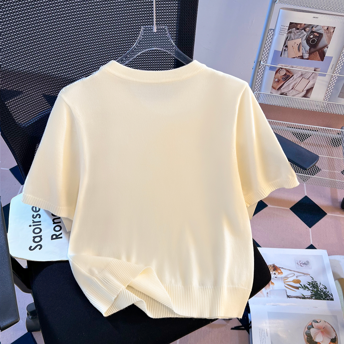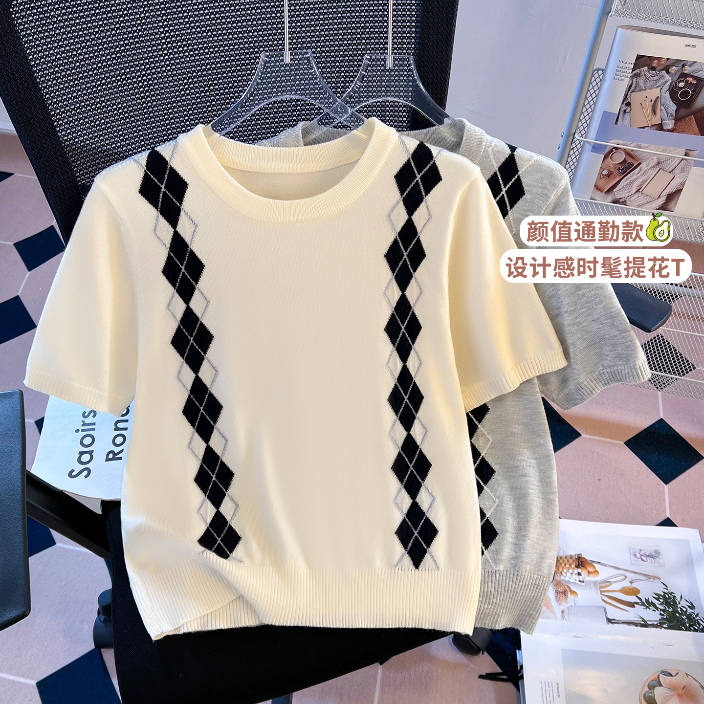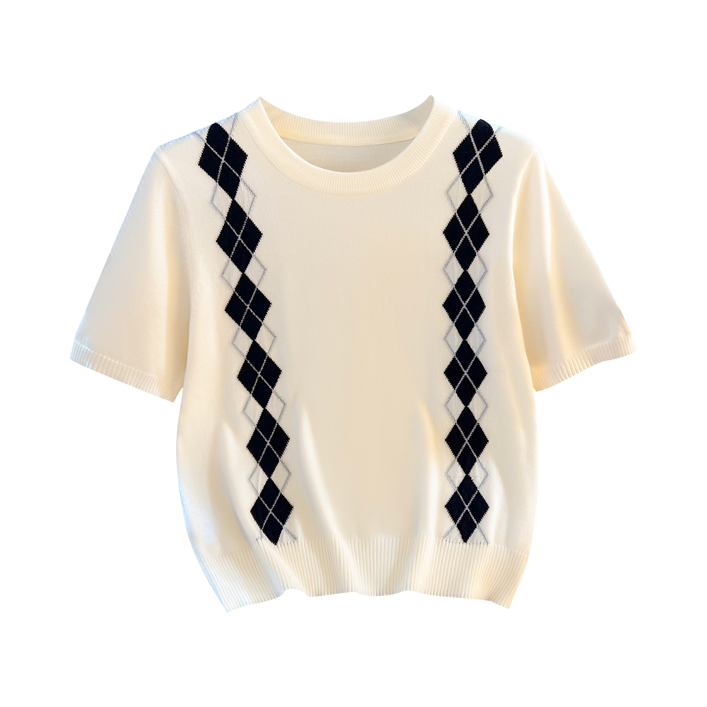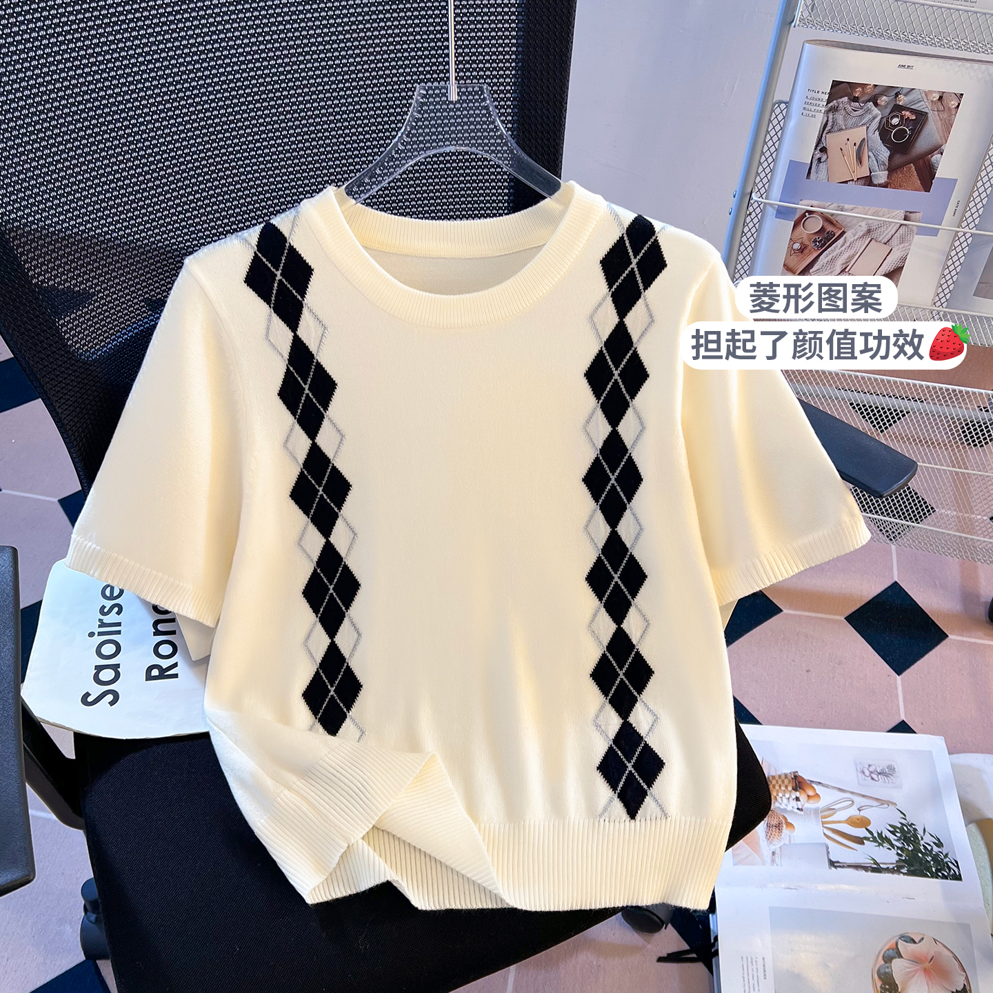 BY10392# 学院风miu系菱形格针织衫短袖T恤女春夏新款英伦风上衣 服裝批發女裝批發服飾貨源