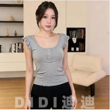 BY10491# 大码美式休闲方领飞袖T恤夏季纯欲辣妹设计感修身显瘦短袖上衣 服裝批發女裝批發服飾貨源