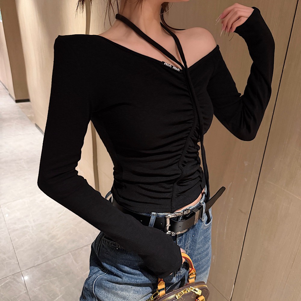 BY10511# 早春新款时尚百搭韩系前打皱显瘦漏垫肩上衣女 服裝批發女裝批發服飾貨源