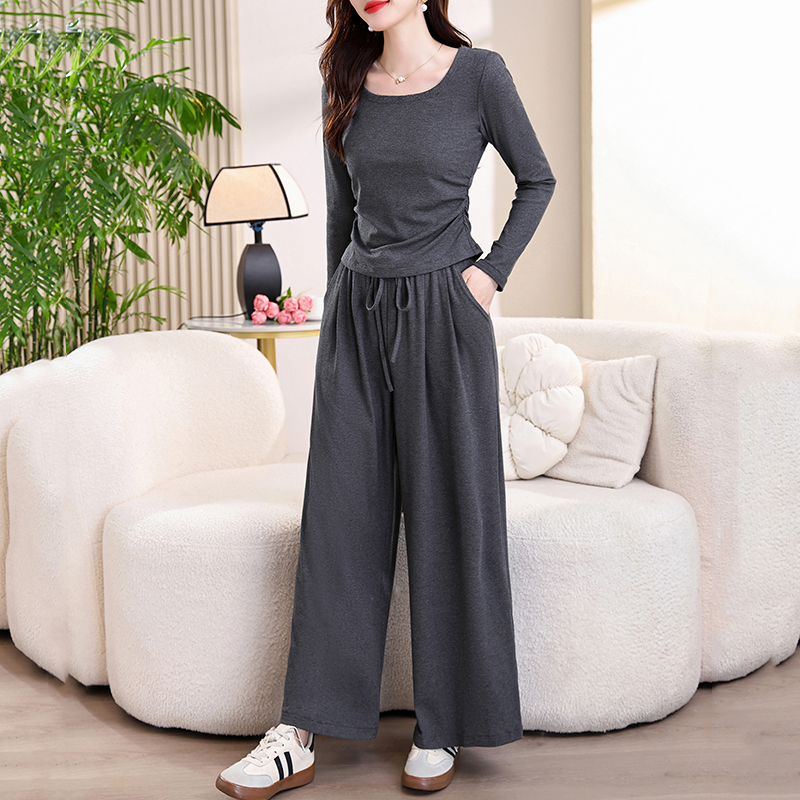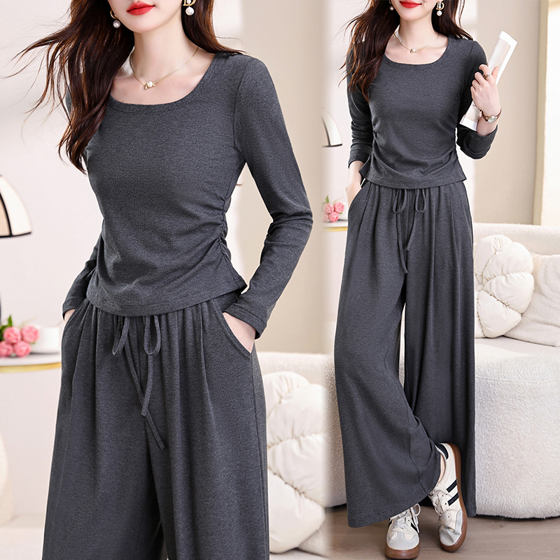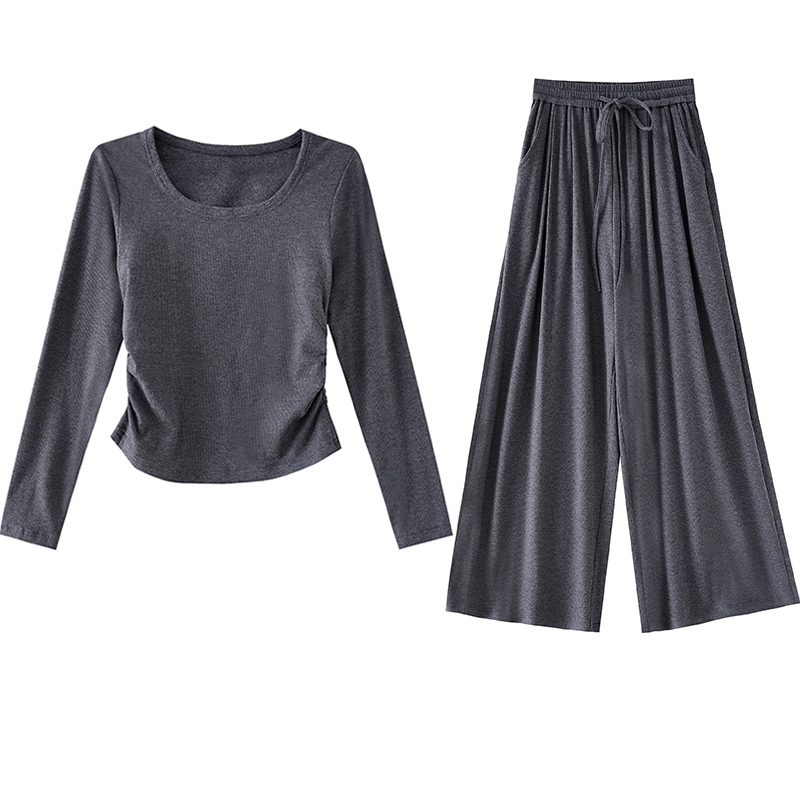 BY10543# 春秋新款刘亦菲薄绒高弹针织塑形U领长袖T恤松紧腰阔腿裤休闲套装 服裝批發女裝批發服飾貨源