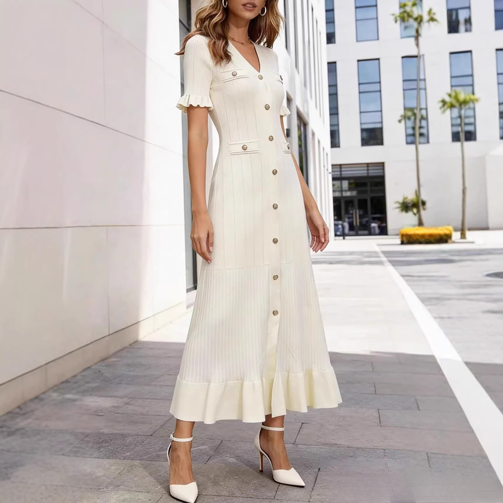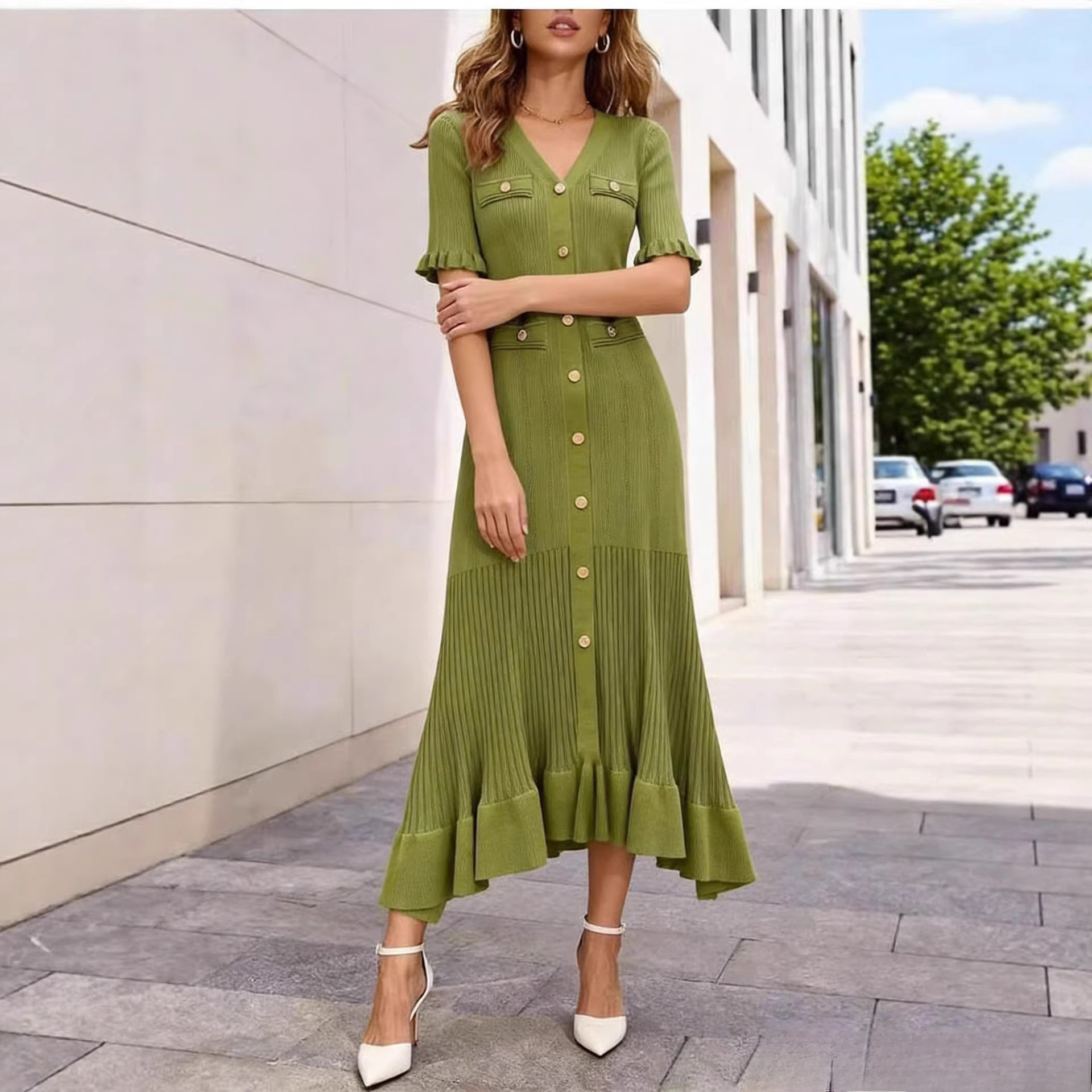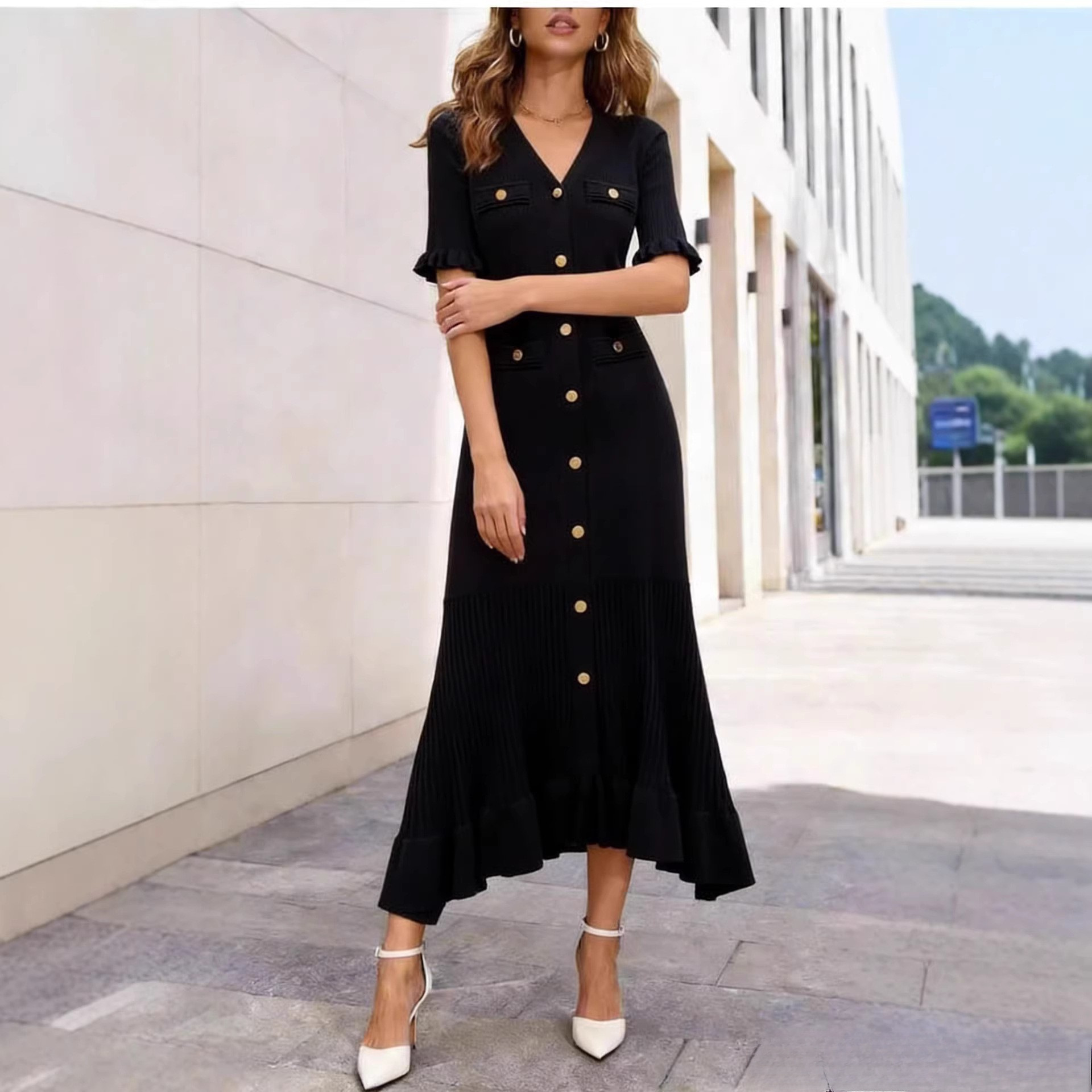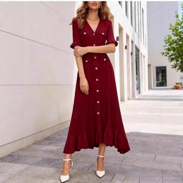 BY10548# 夏季新款V领短袖女士裙跨境欧美新款修身显瘦a字针织连衣裙 服裝批發女裝批發服飾貨源