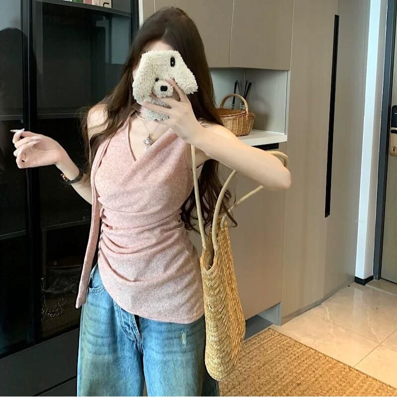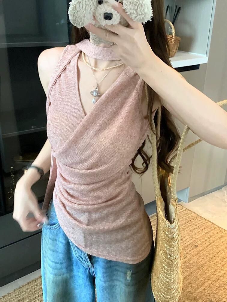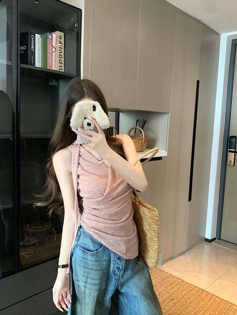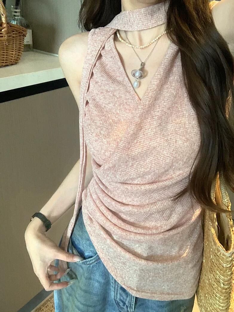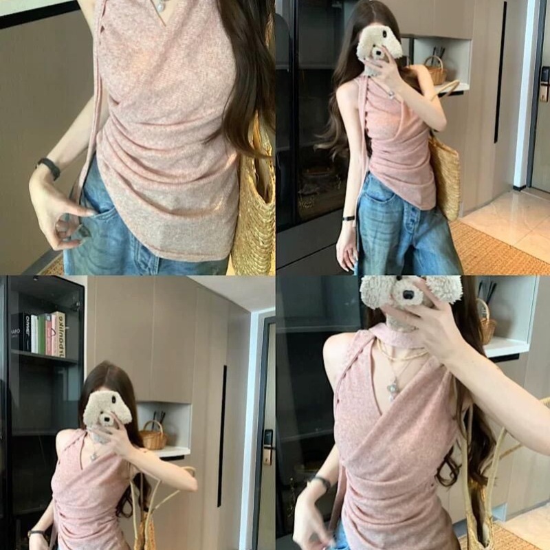 BY10588# 粉色甜美外穿背心女夏季新款飘带美背挂脖吊带不规则辣妹修身上衣 服裝批發女裝批發服飾貨源