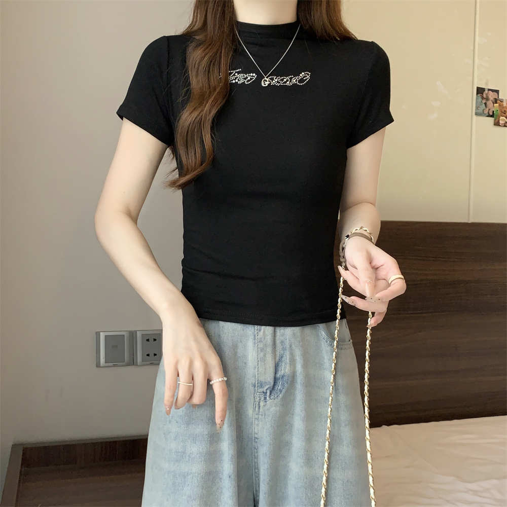 BY10605# 棉短袖T恤女半高领烫钻 服裝批發女裝批發服飾貨源