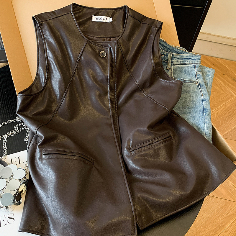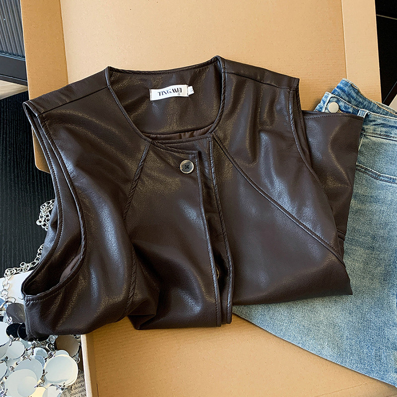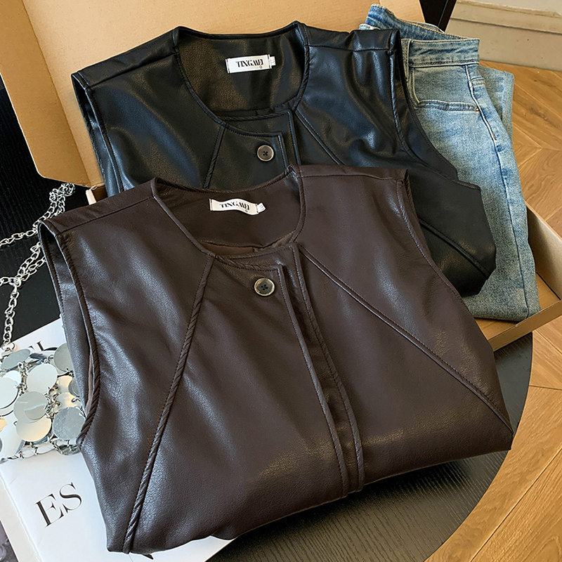 BY10635# 胖妹妹大码宽松无袖皮衣马夹女装春秋新款韩系通勤百搭时尚潮 服裝批發女裝批發服飾貨源