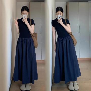 BY10666# 新款韩版短袖连衣裙气质夏季拼接设计感收腰小众休闲显瘦长裙 服裝批發女裝批發服飾貨源
