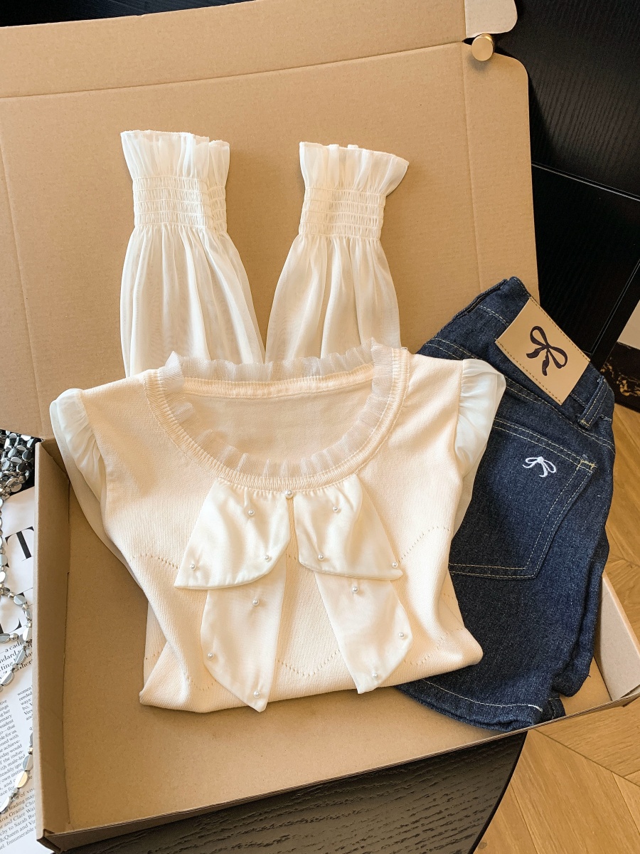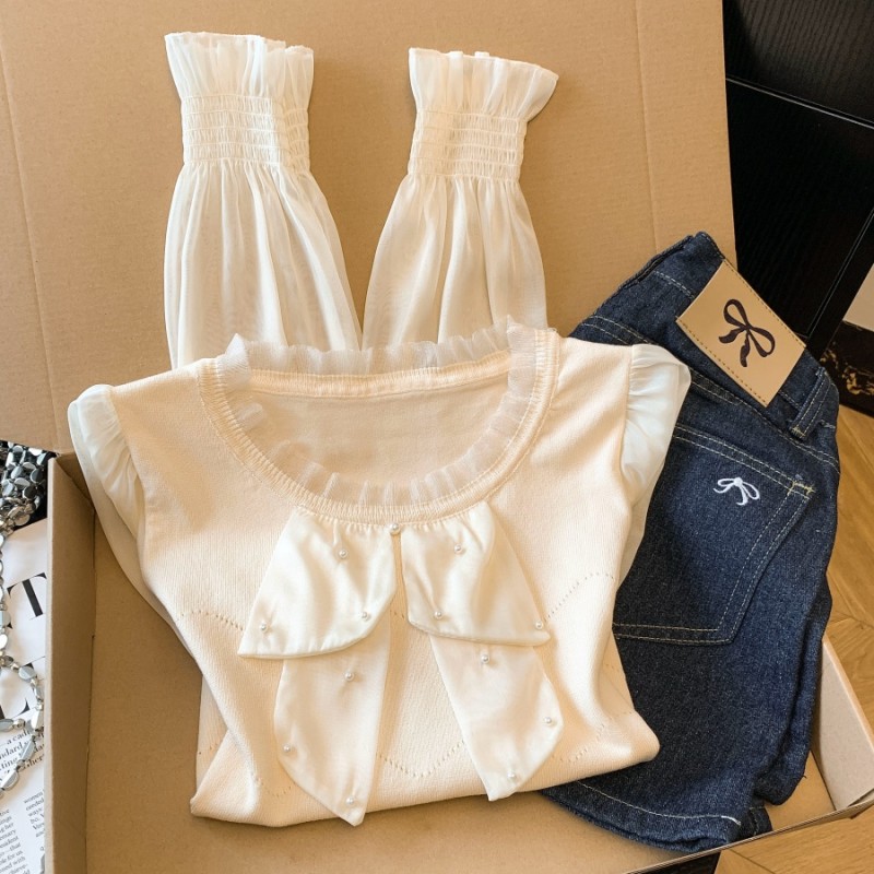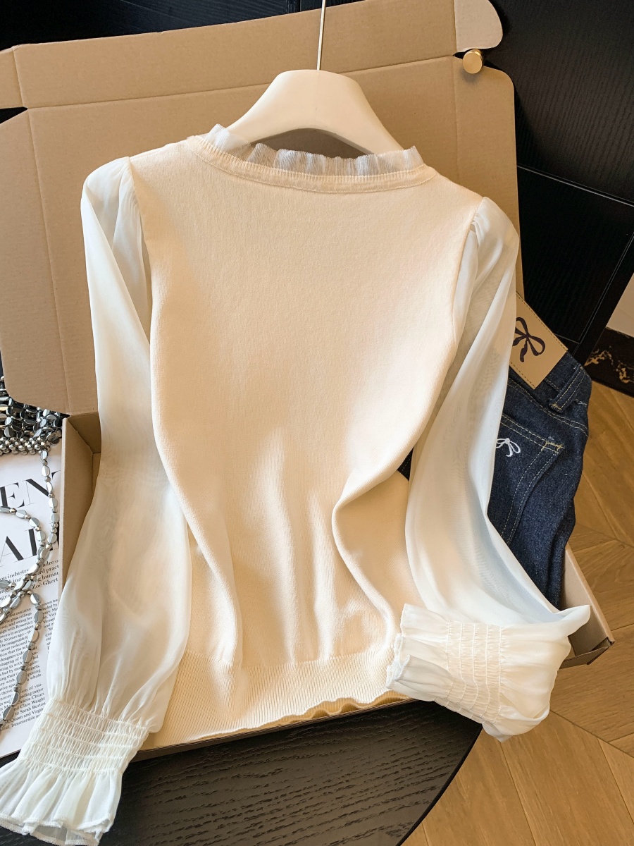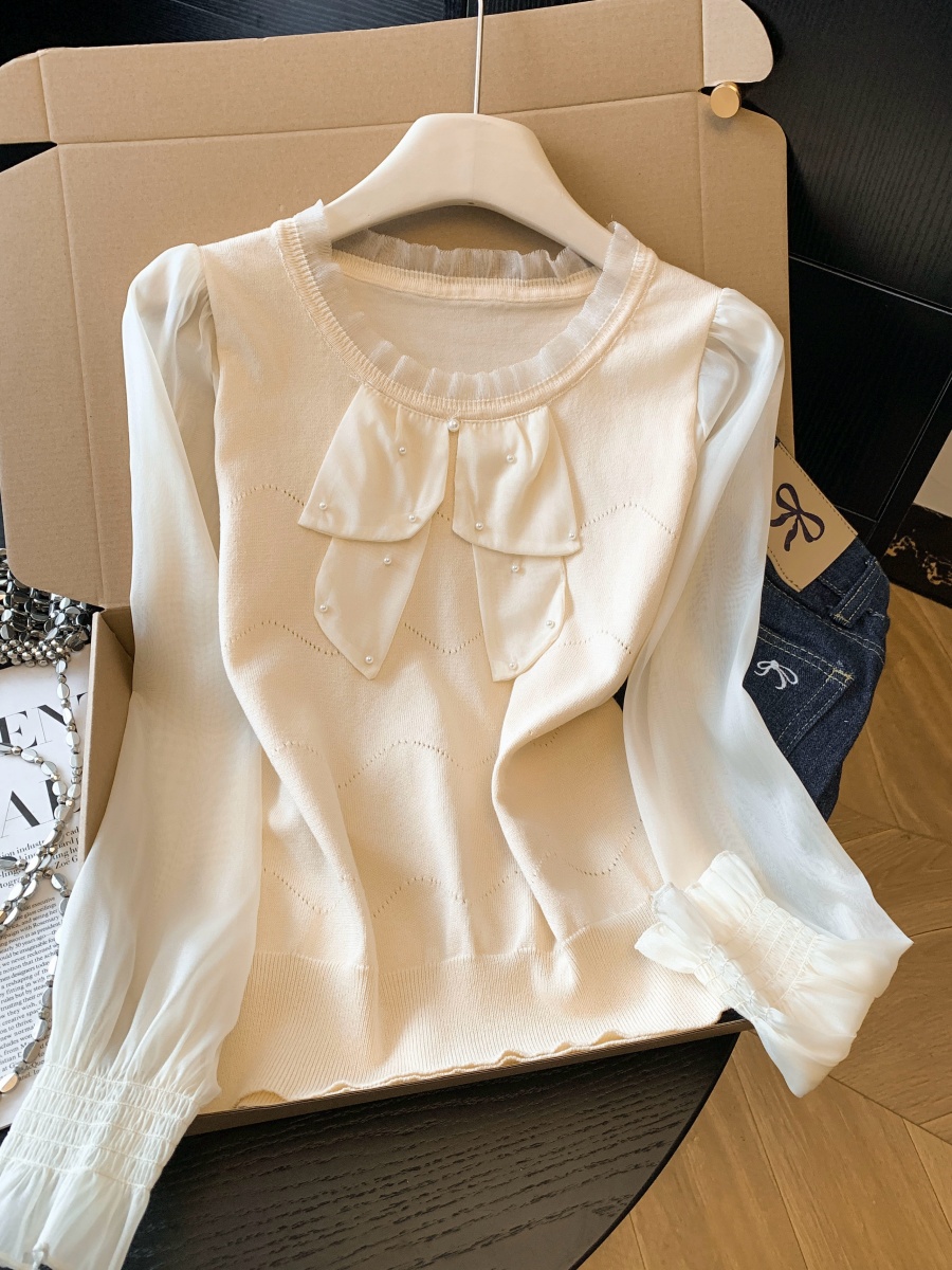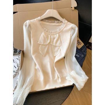 BY10696# 春季新款针织拼接雪纺衫圆领法式轻奢高级感钉珠上衣 服裝批發女裝批發服飾貨源