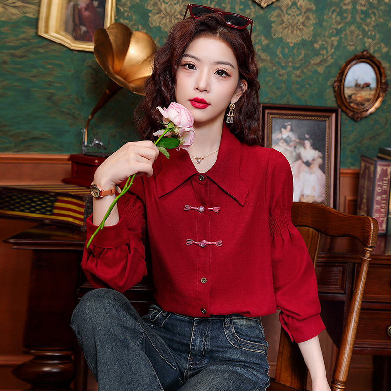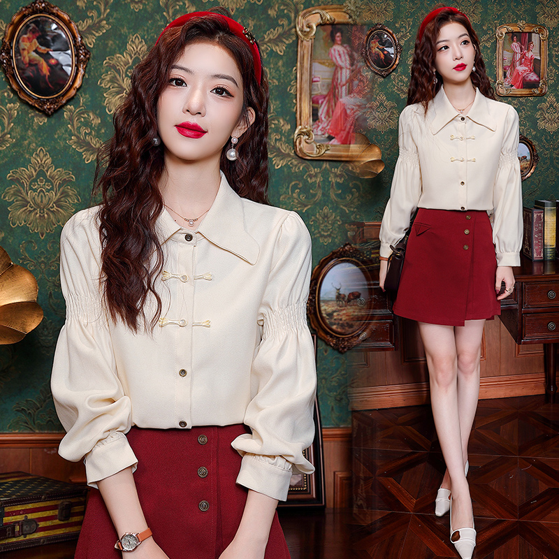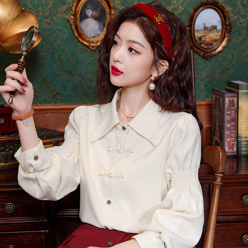 BY10703# 春季新款polo领复古盘扣长袖衬衫女国风女士衬衣 服裝批發女裝批發服飾貨源