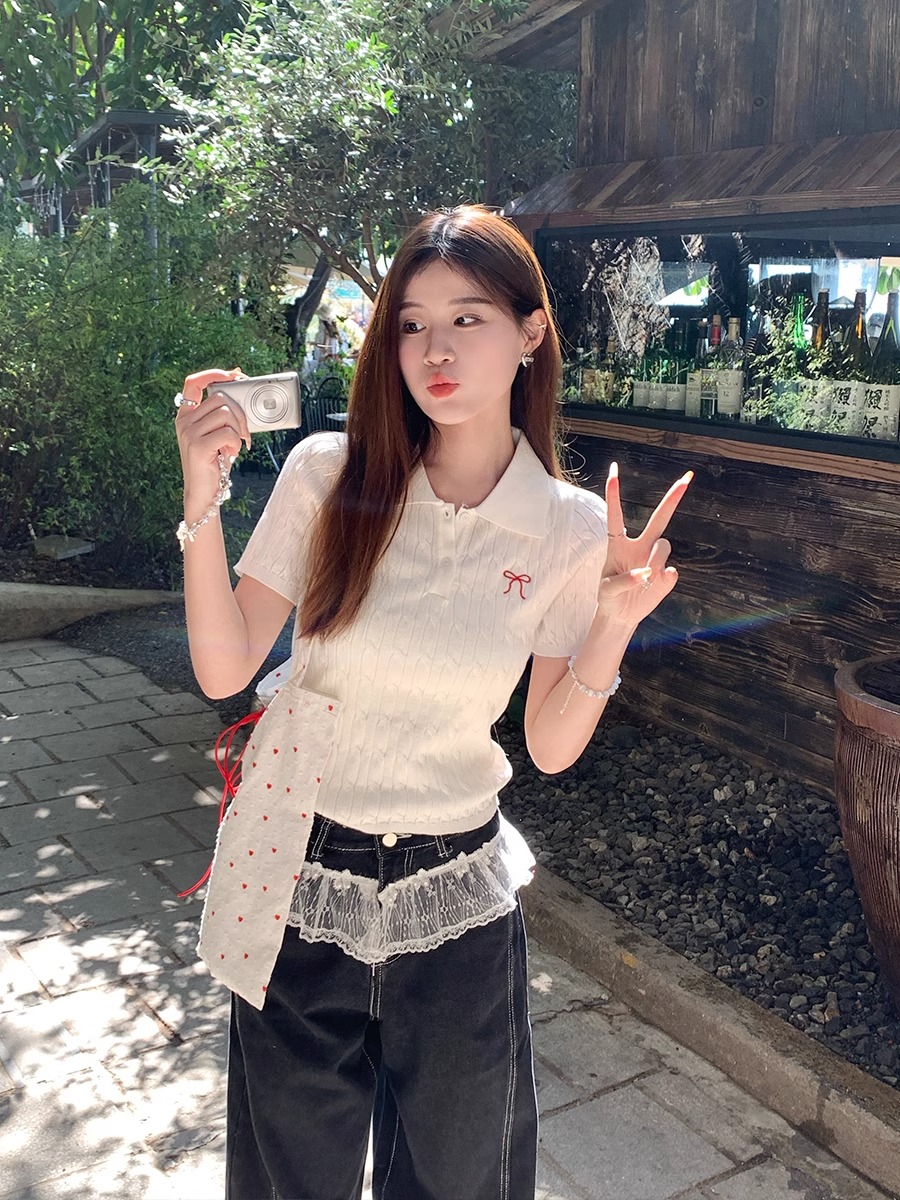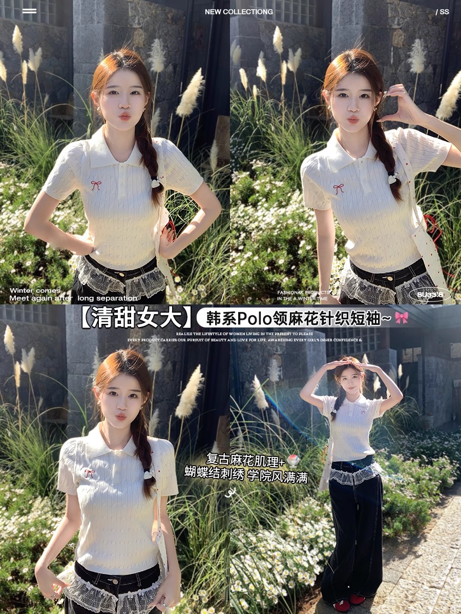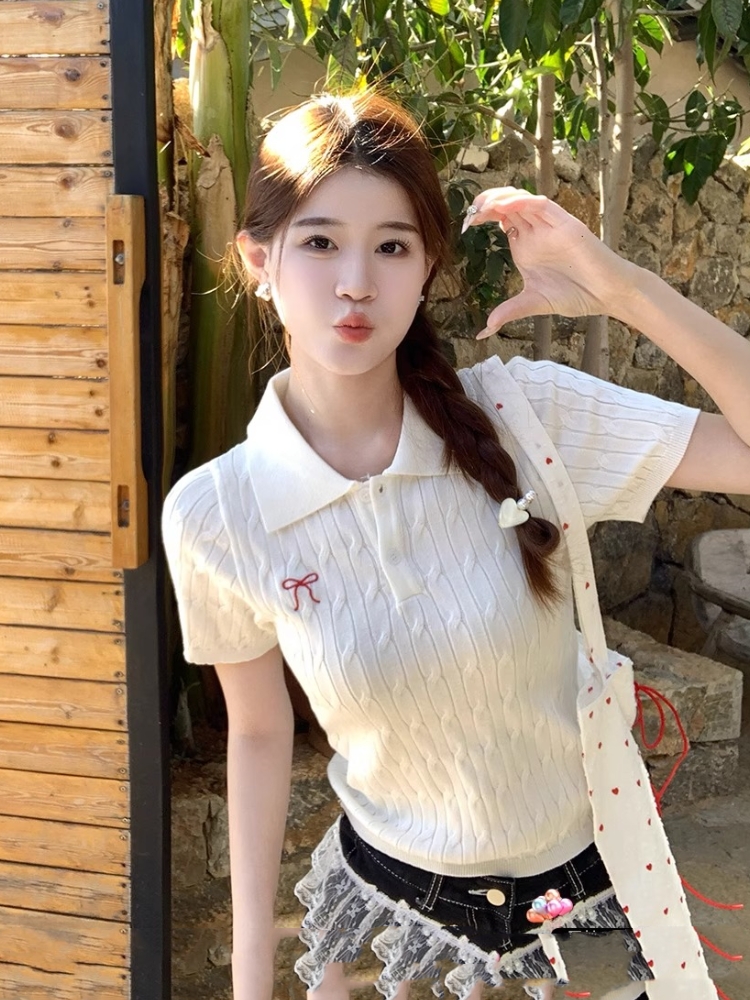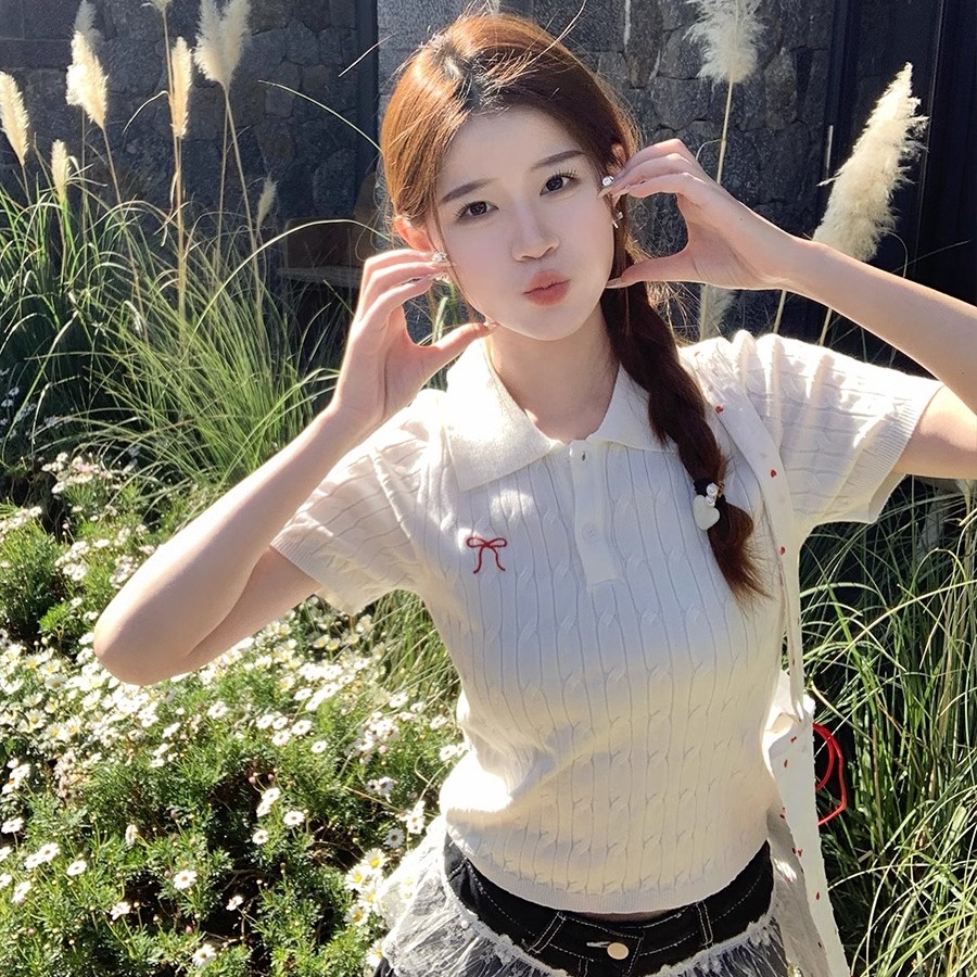 BY10719# polo领针织短袖女新款刺绣复古学院风麻花毛衣t恤上衣 服裝批發女裝批發服飾貨源