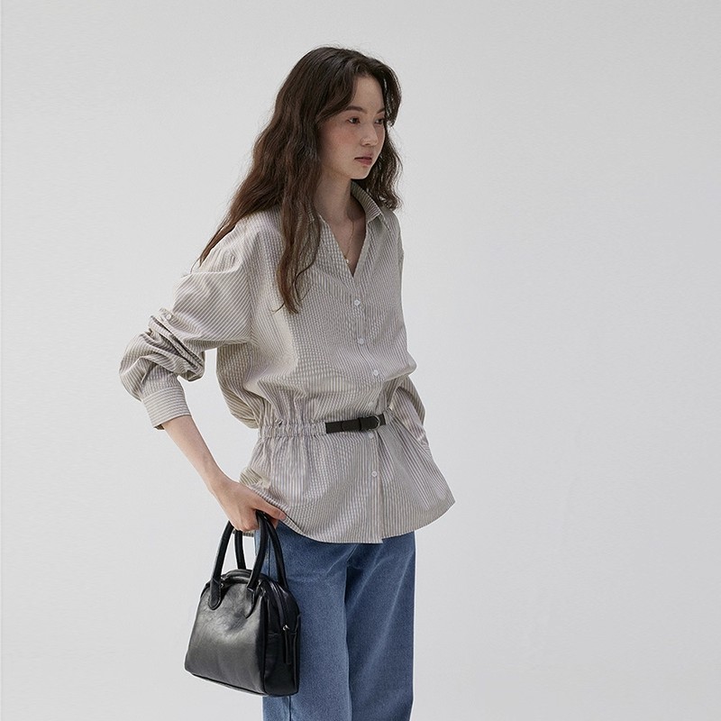 芥末派VOOE设计V领收腰条纹宽松衬衫女早秋新款气质通勤上衣 服裝批發女裝批發服飾貨源