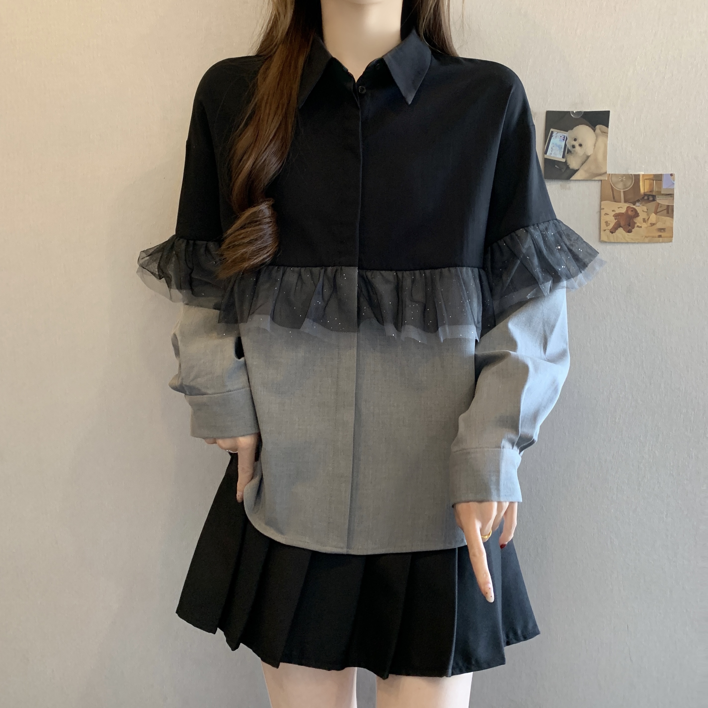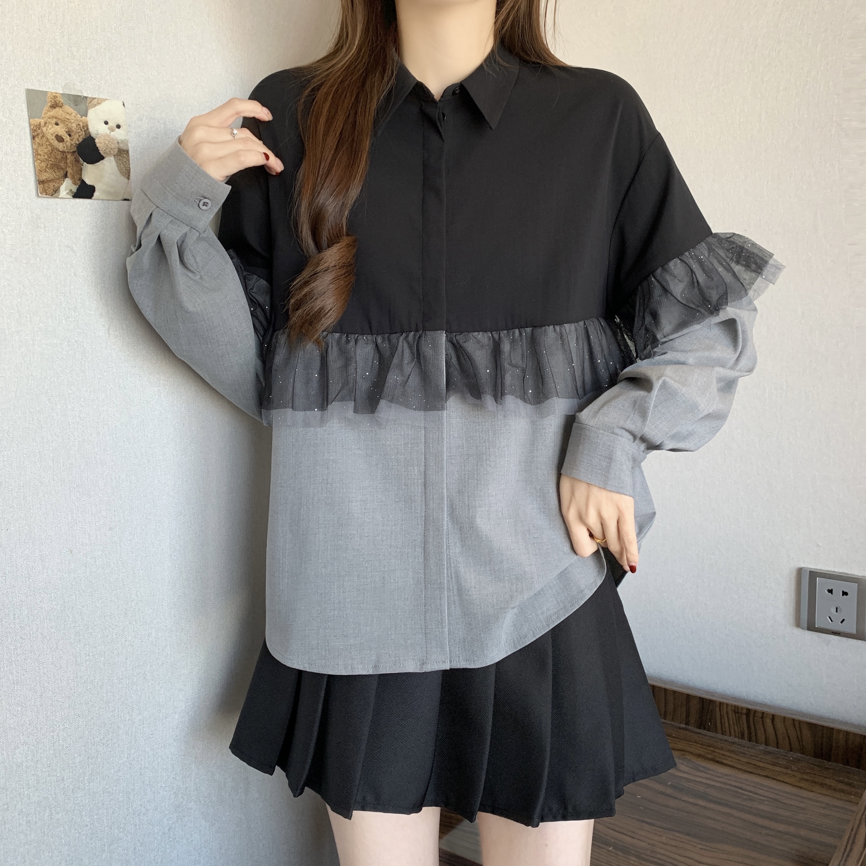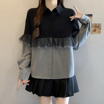 BY11201# 大码时尚撞色翻领网纱拼接休闲百搭长袖衬衫 服裝批發女裝批發服飾貨源