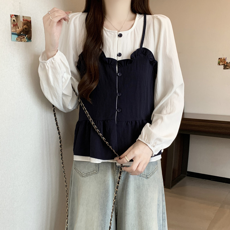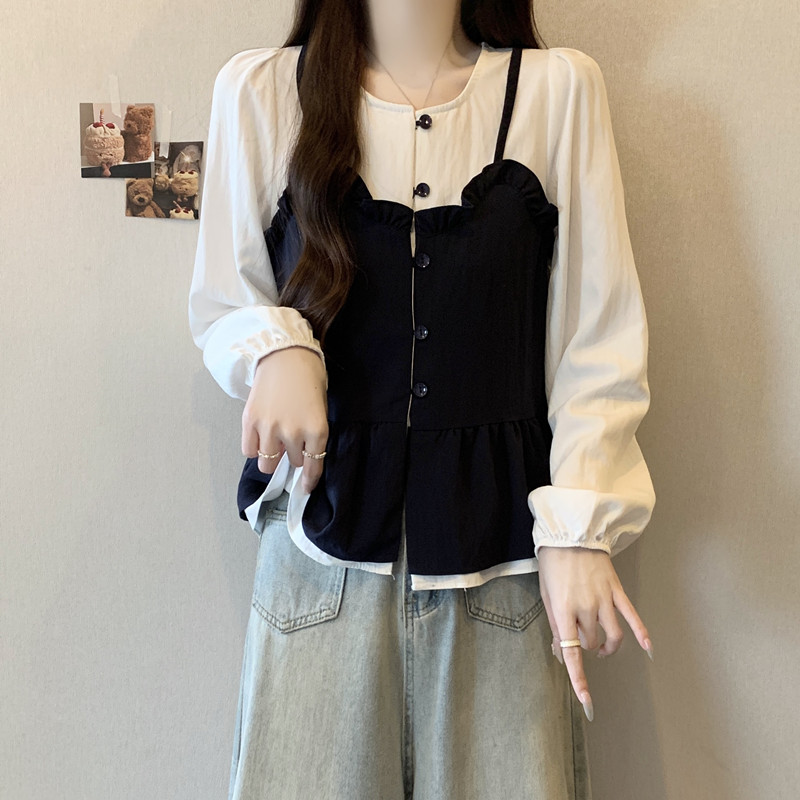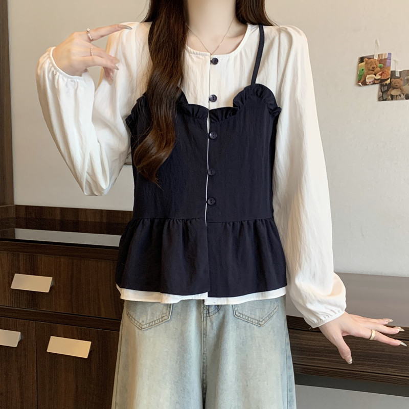 BY11215# 大码女装春季新款遮肉显瘦减龄拼接木耳边假两件宽松长袖上衣 服裝批發女裝批發服飾貨源