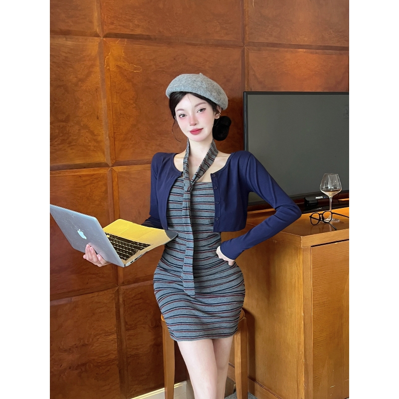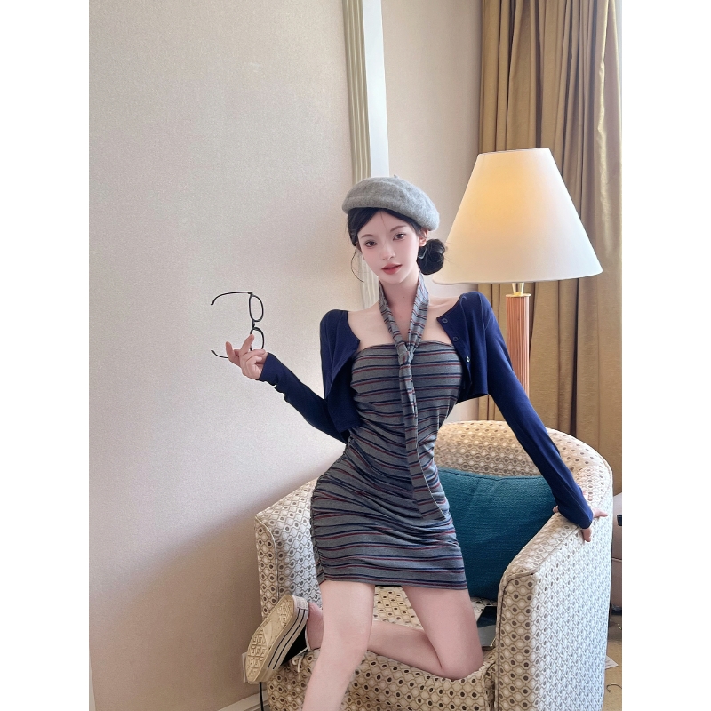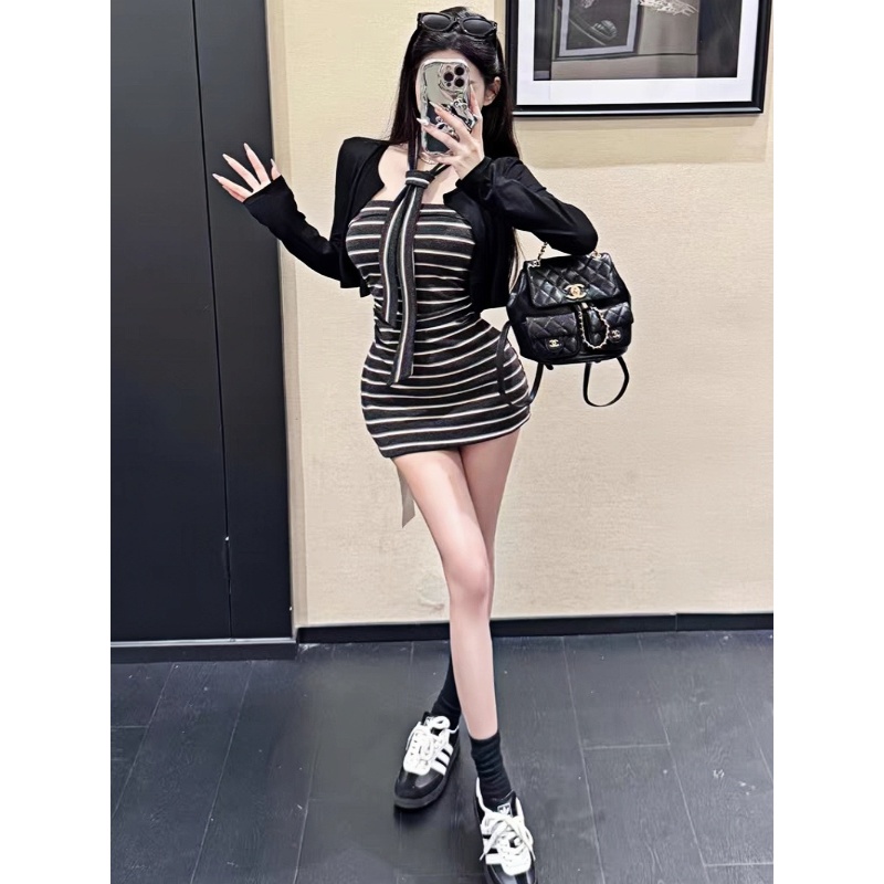 BY11306# 甜辣减龄装纯欲性感条纹领带抹胸连衣裙+开衫外套两件套 服裝批發女裝批發服飾貨源