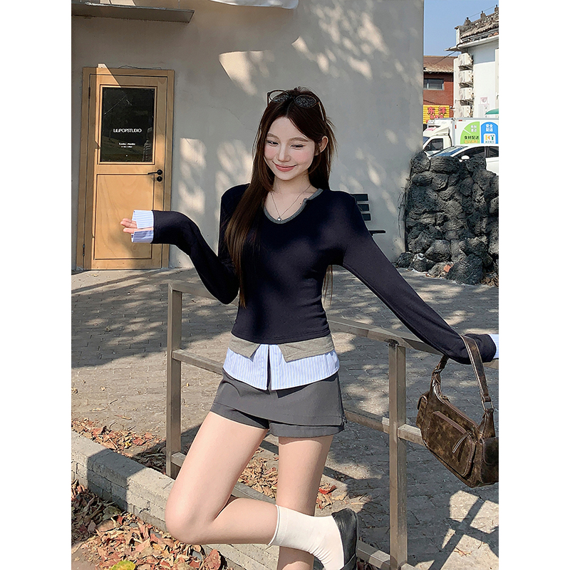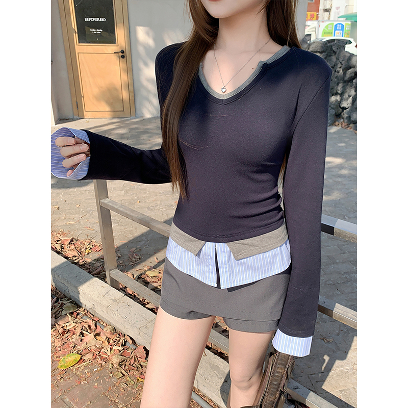 BY11329# 韩版撞色假两件v领刺绣t恤女春季新款时尚修身显瘦打底衫上衣 服裝批發女裝批發服飾貨源
