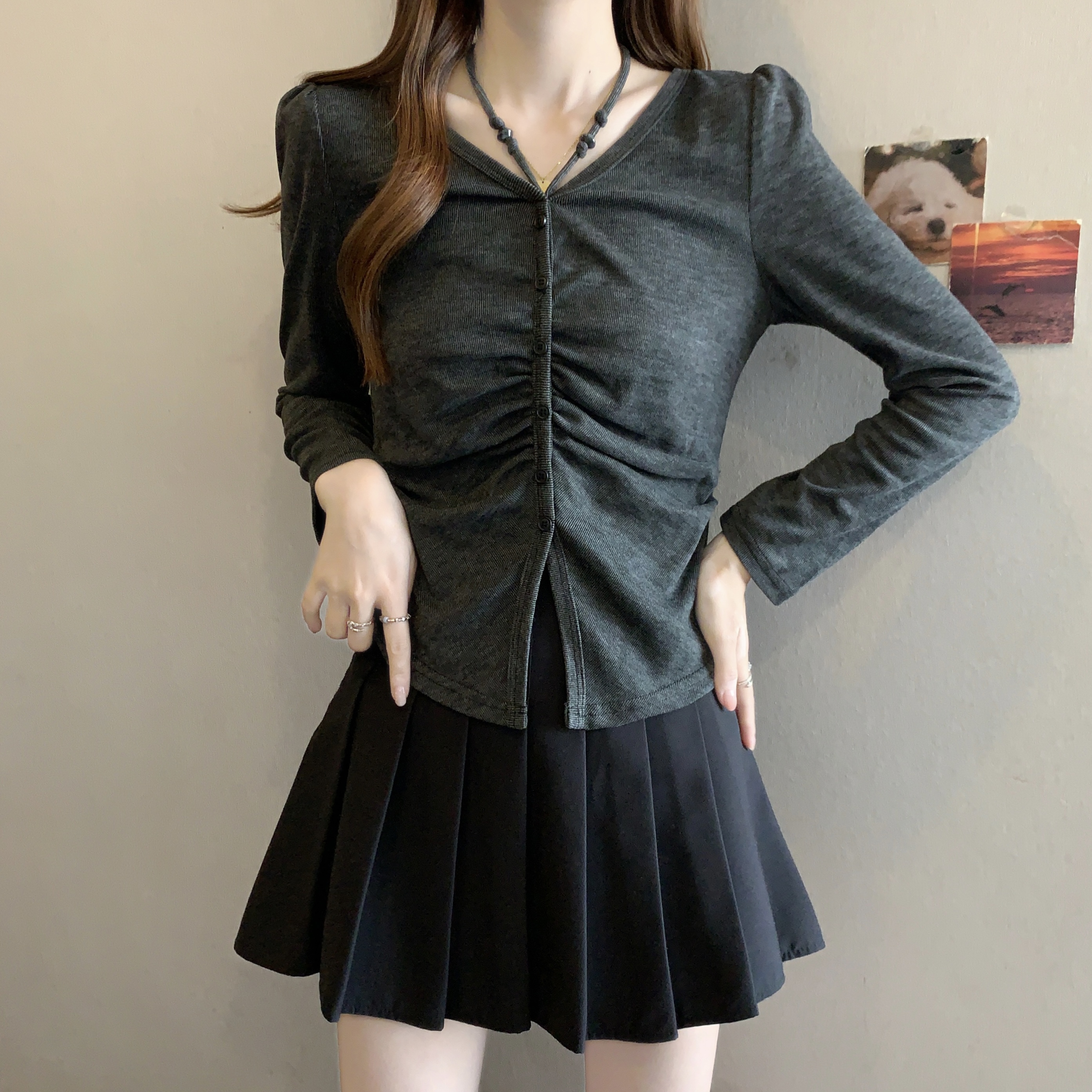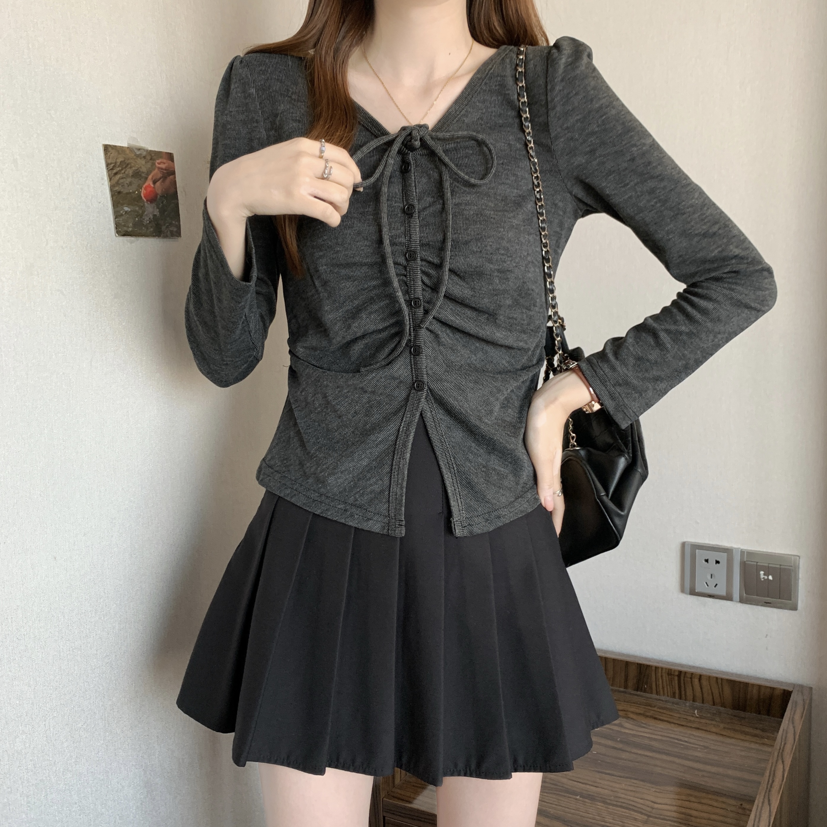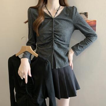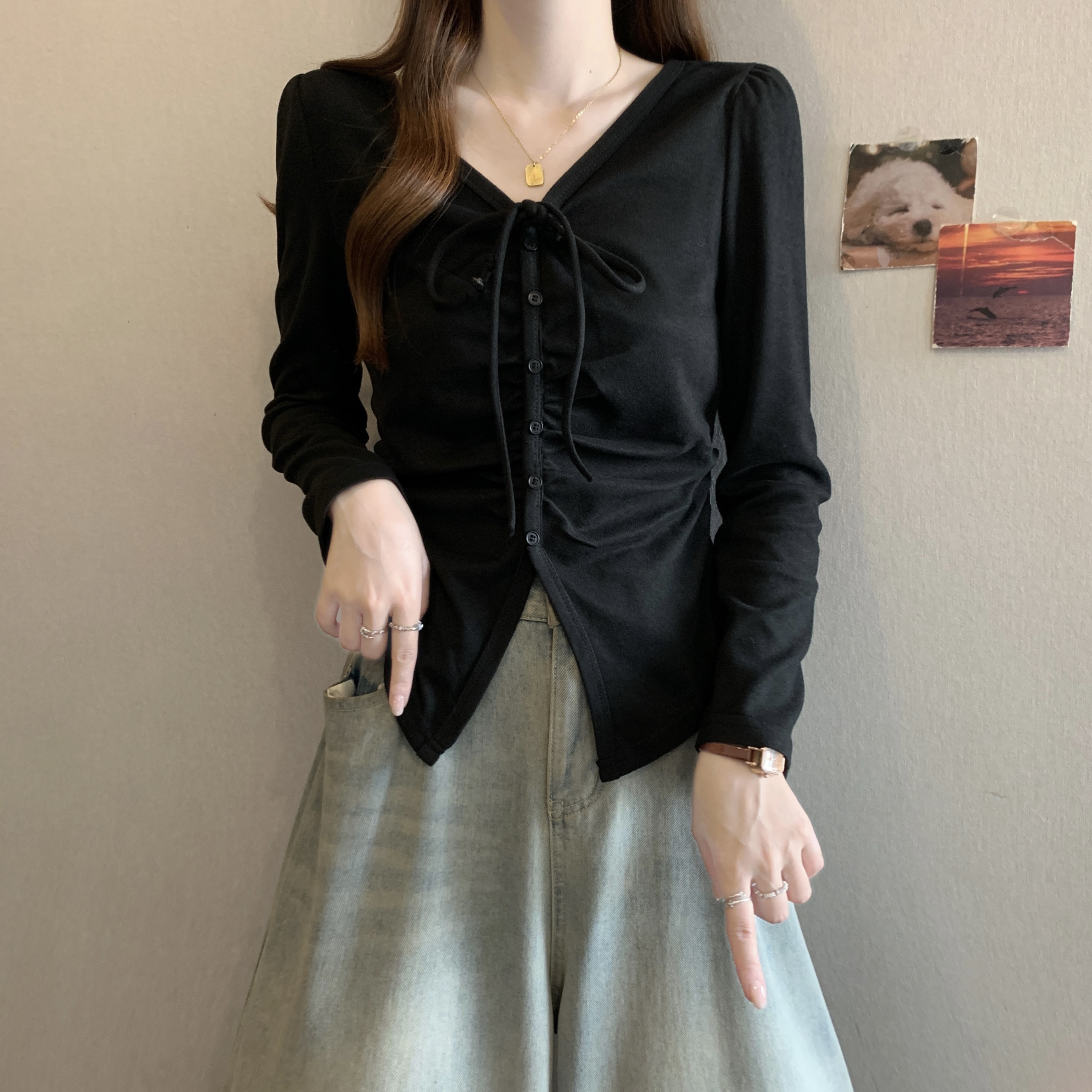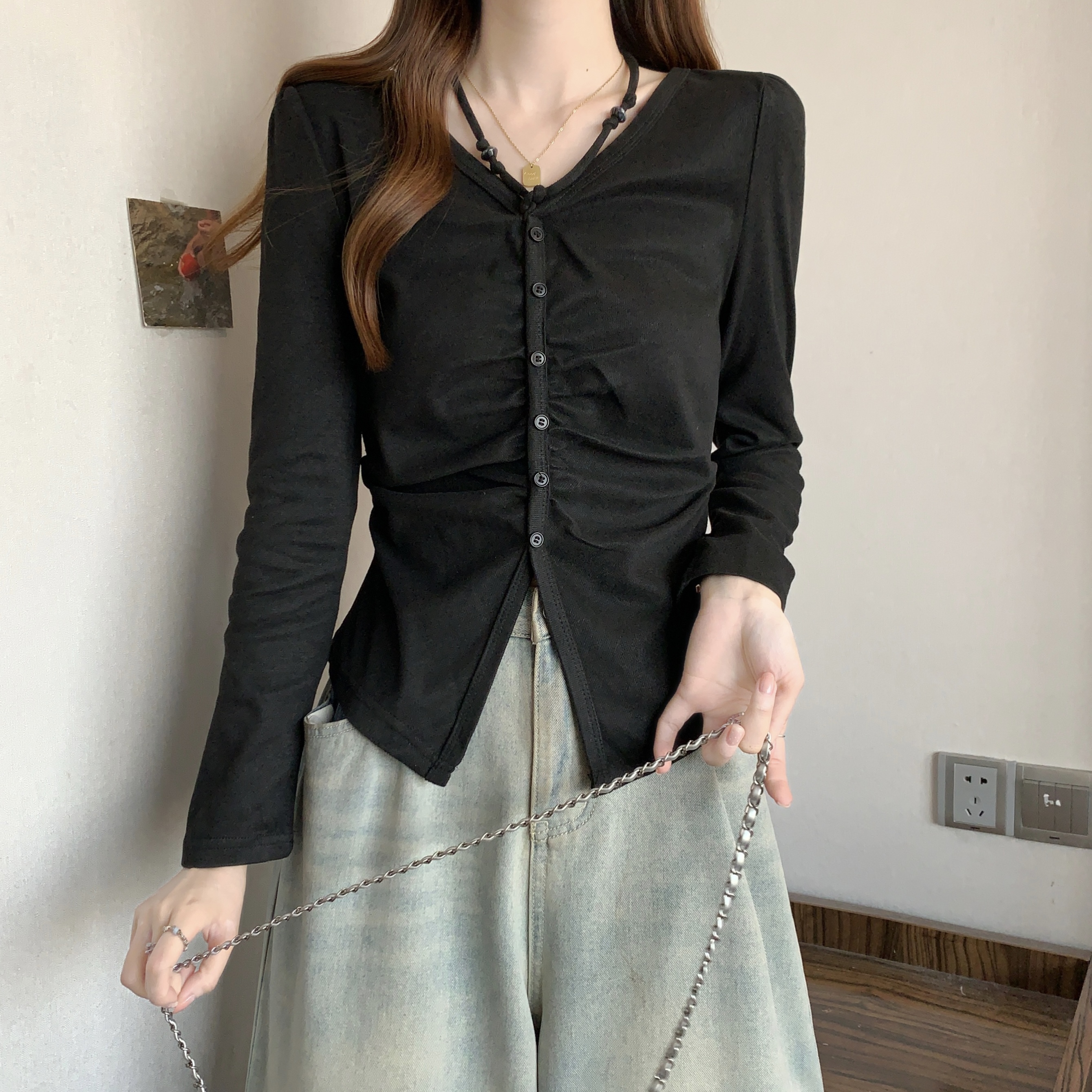 BY11335# 新款胖MM春款时尚设计感小众抽绳挂脖系带显瘦v百搭上衣 服裝批發女裝批發服飾貨源