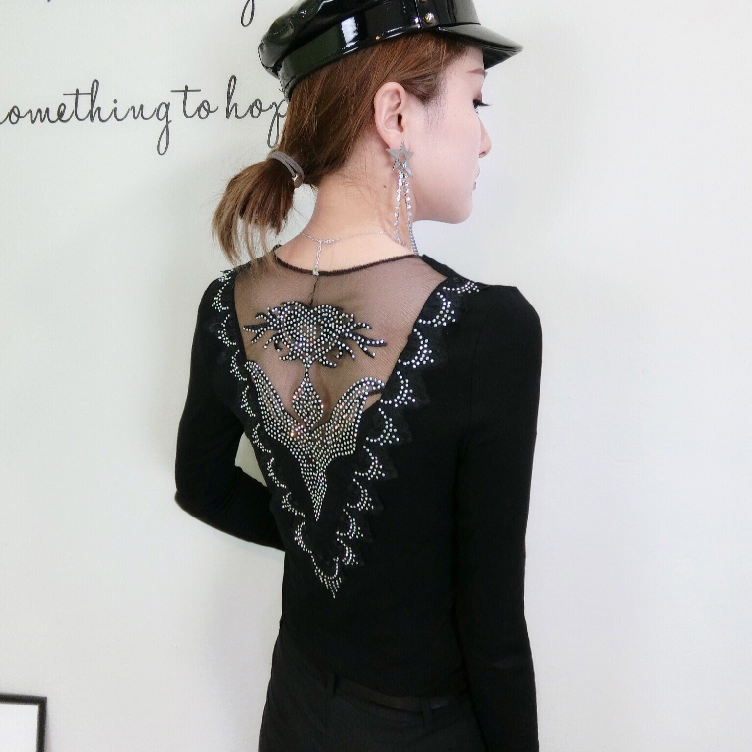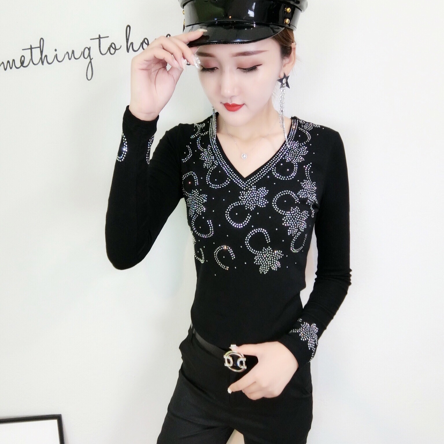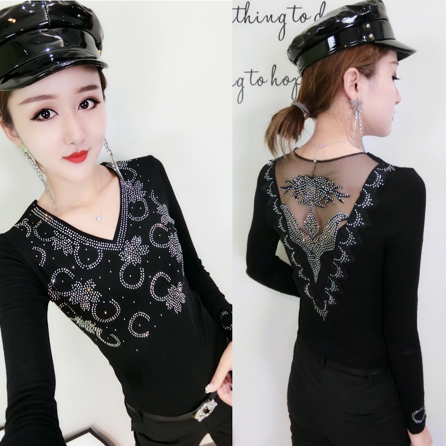 BY11338# 春装新款修身显瘦时尚花边镂空重工烫钻圆领T恤小衫女 服裝批發女裝批發服飾貨源