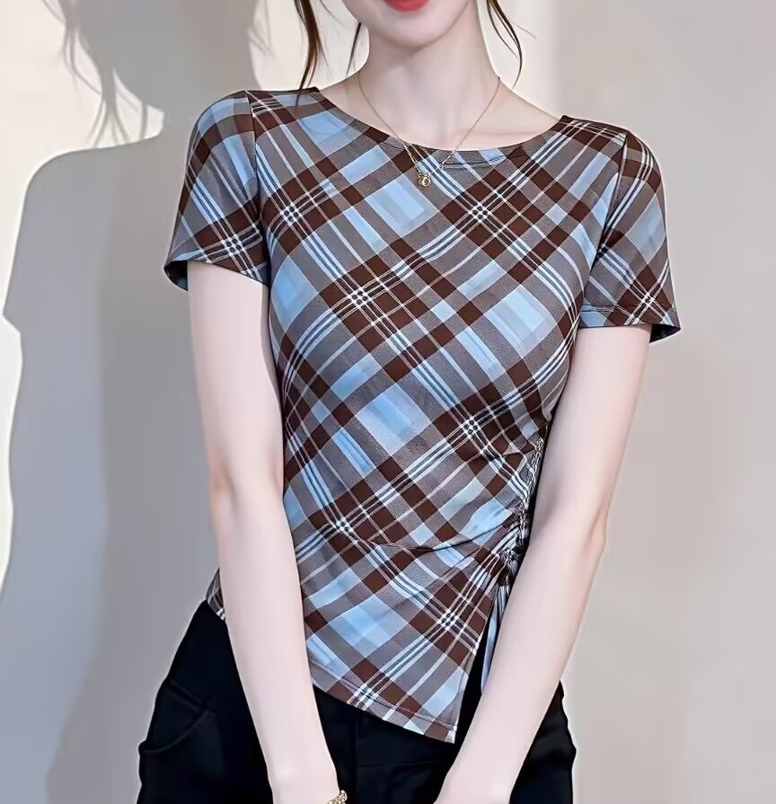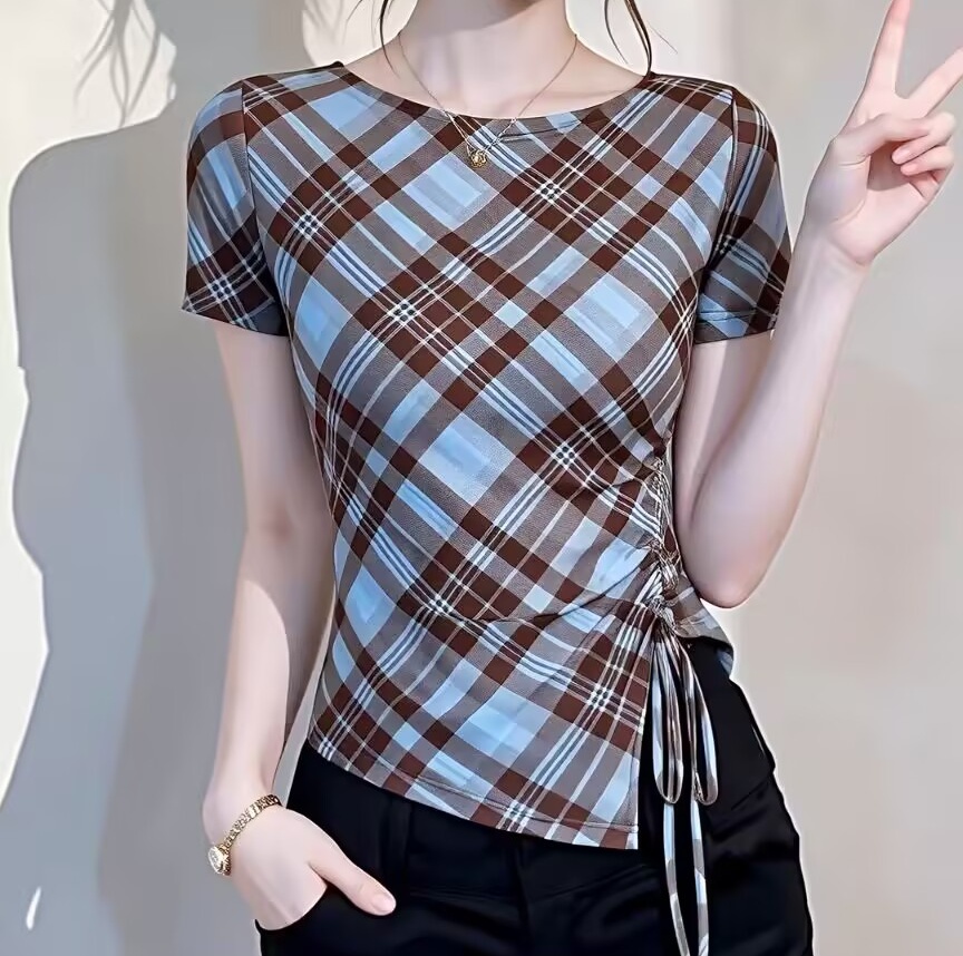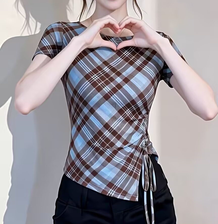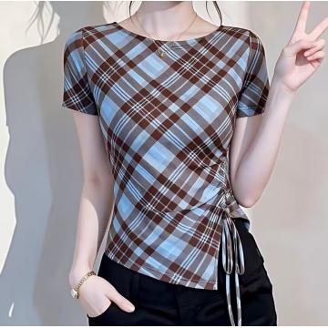 BY11386# 复古格纹网纱短袖T恤女夏季新款不规则抽绳洋气显瘦减龄上衣 服裝批發女裝批發服飾貨源