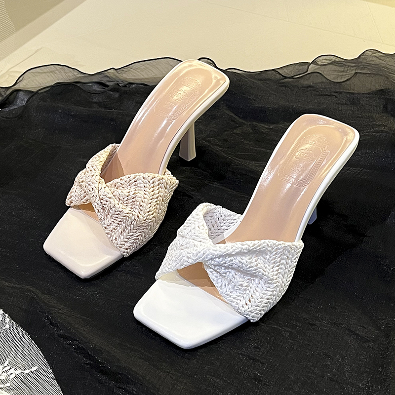 X-33076# 新款小众设计编织方头露趾凉拖鞋马蹄跟绝美外穿凉鞋通勤高跟鞋女 鞋子批发女鞋批发凉鞋货源