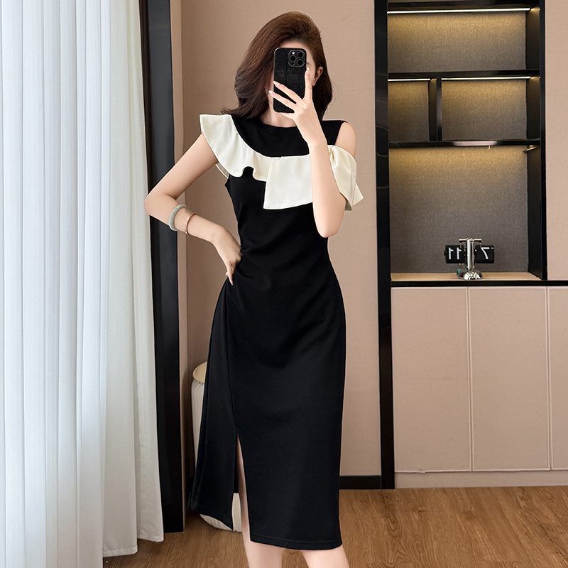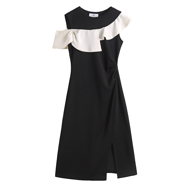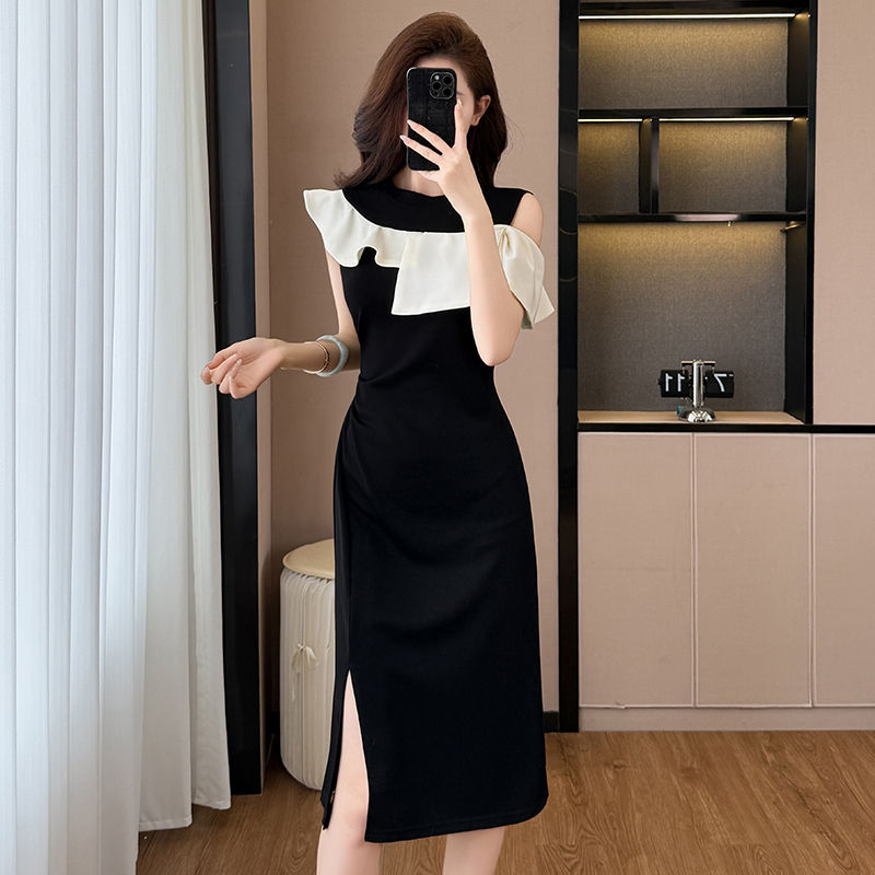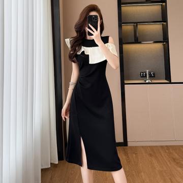时尚洋气修身气质显瘦撞色拼接大码女装胖mm夏季连衣裙子黑色收腰 服裝批發女裝批發服飾貨源