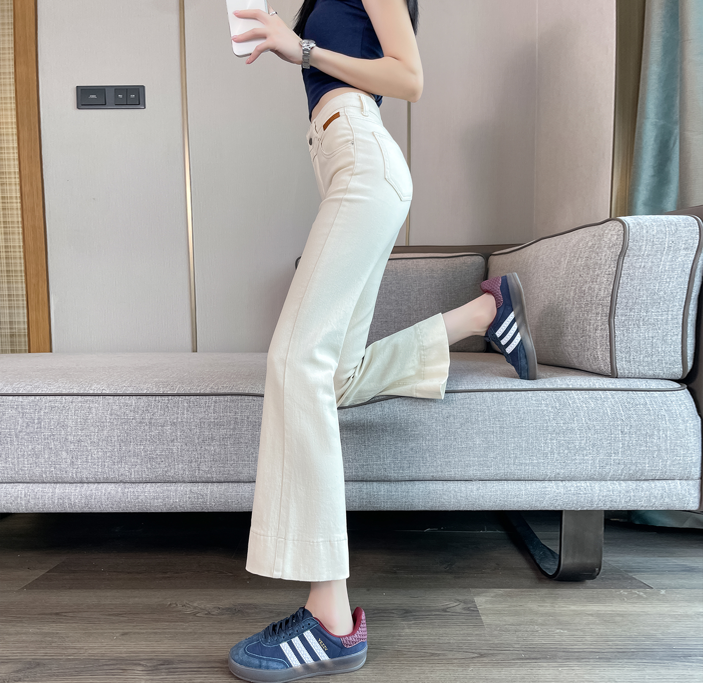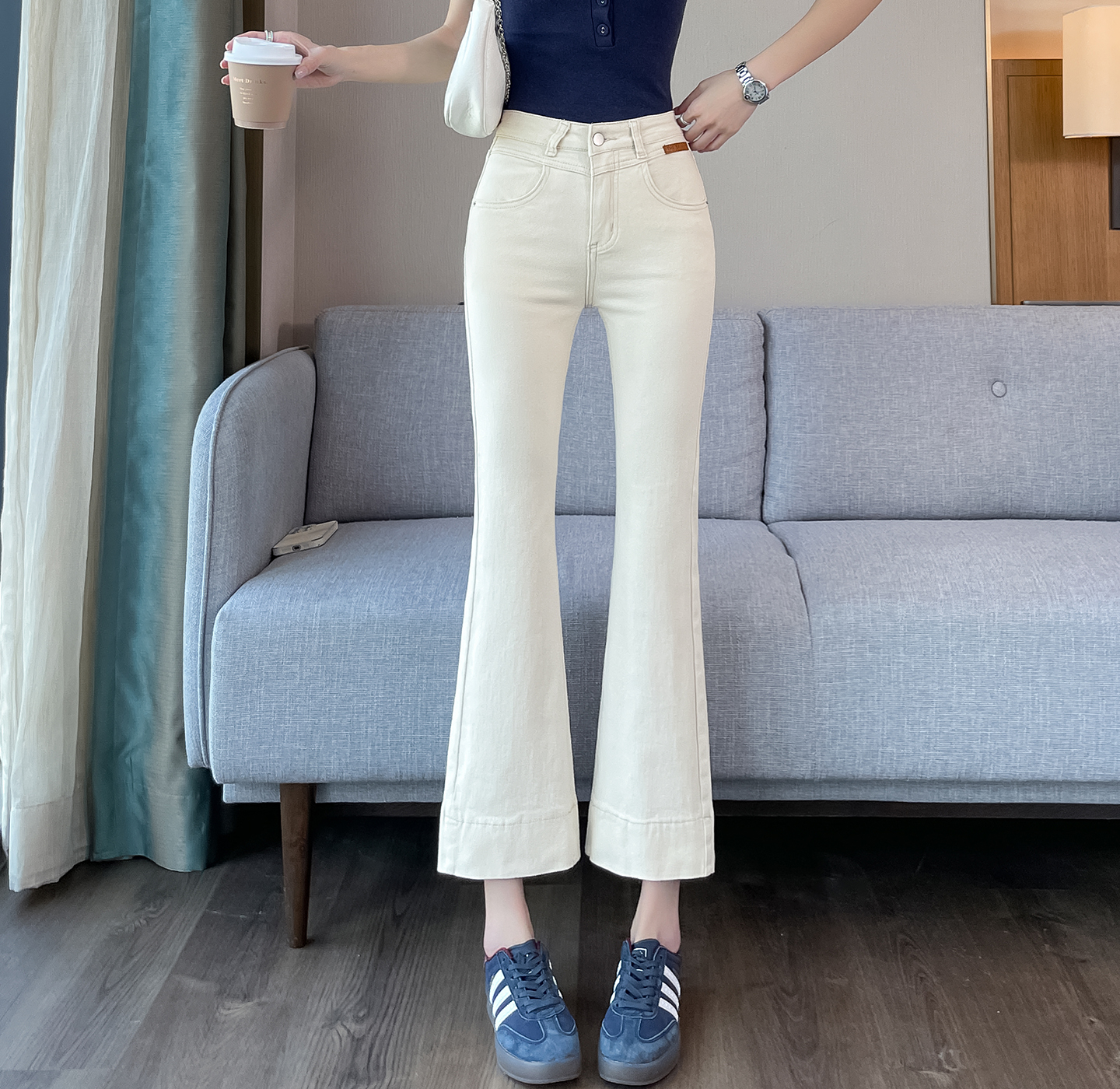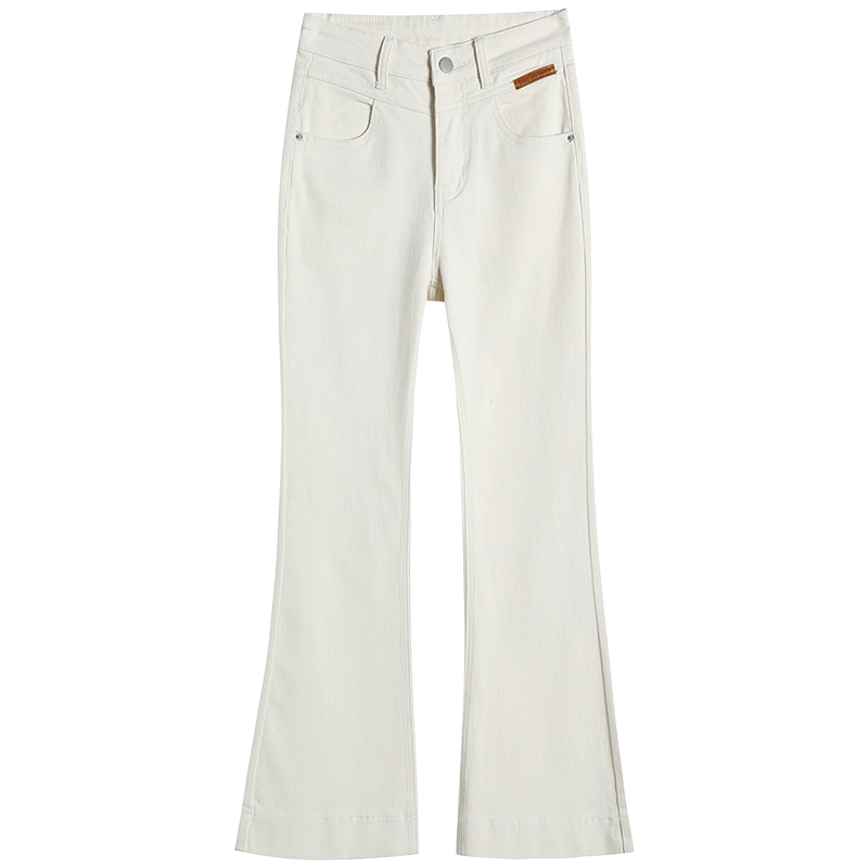 BY17466# 白色喇叭裤女九分裤新款弹力小个子设计感梨形显瘦微喇牛仔裤 服裝批發女裝批發服飾貨源