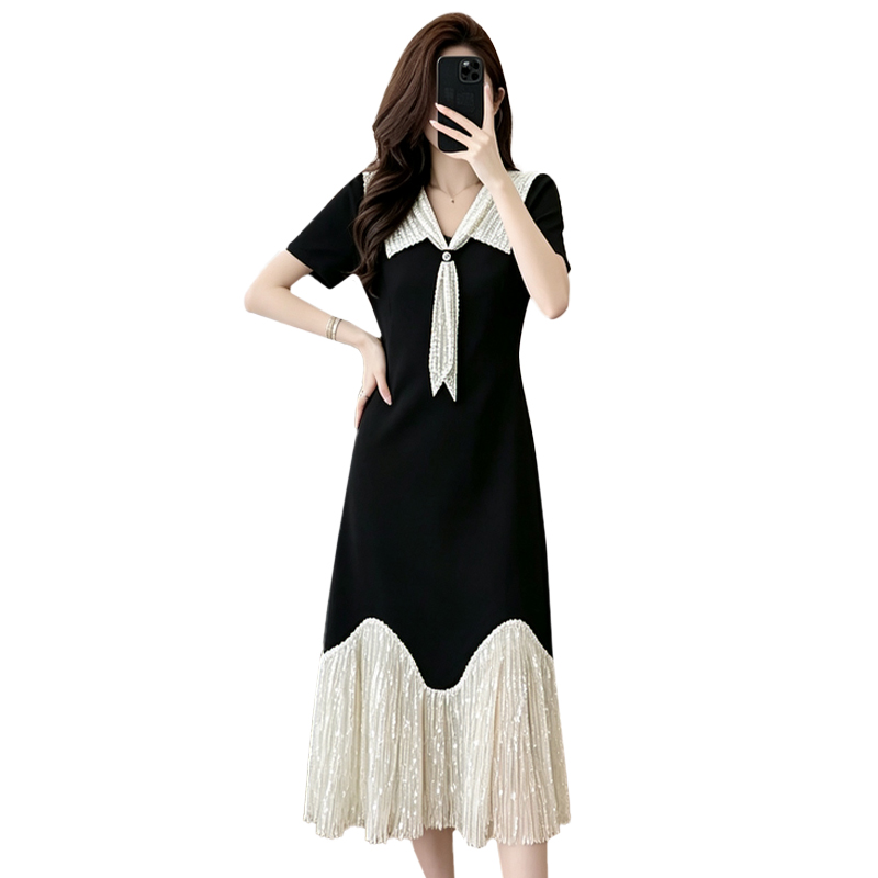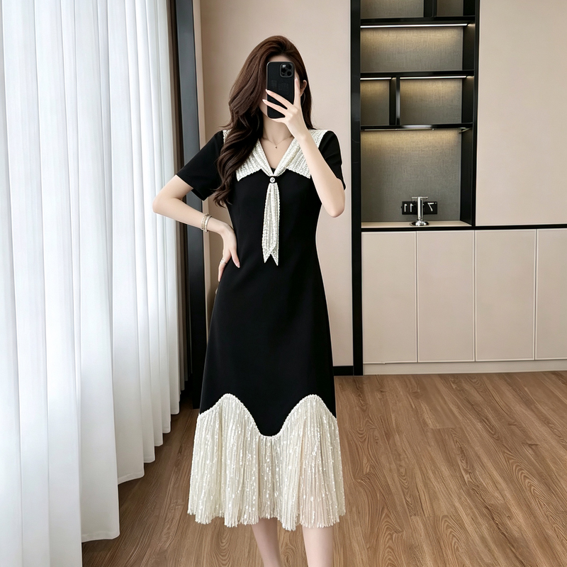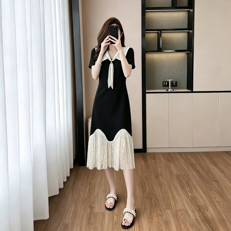 BY17499# 轻奢简约舒适感拼接重工刺绣瘦气质连衣裙JT 服裝批發女裝批發服飾貨源
