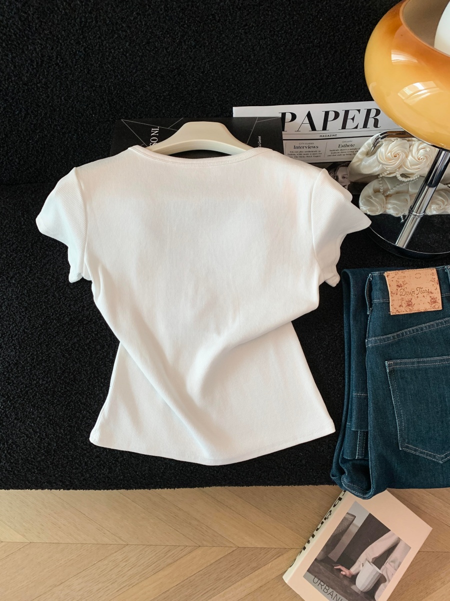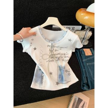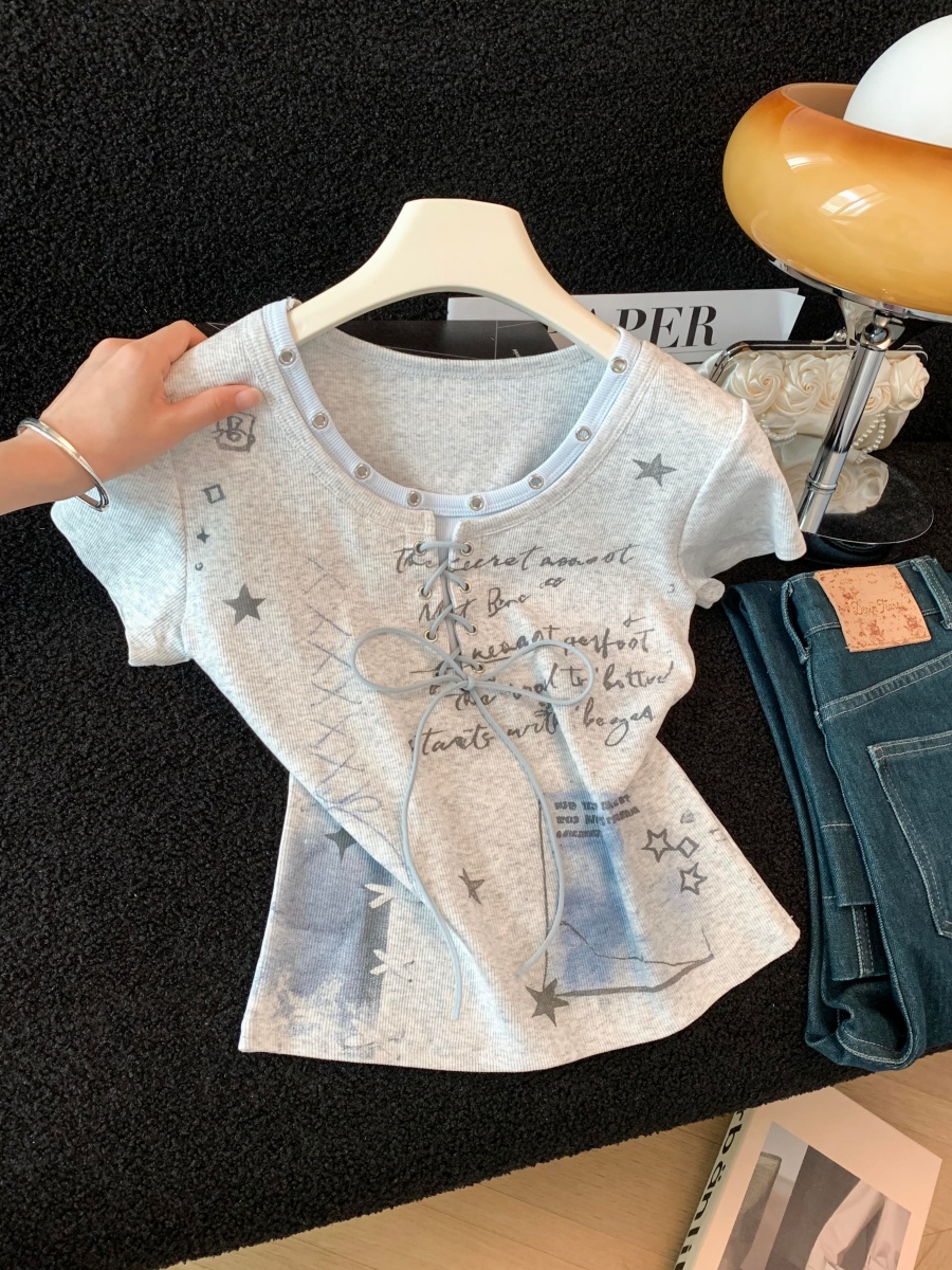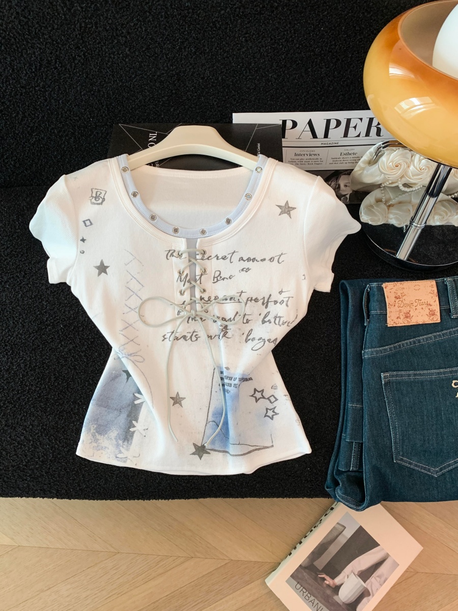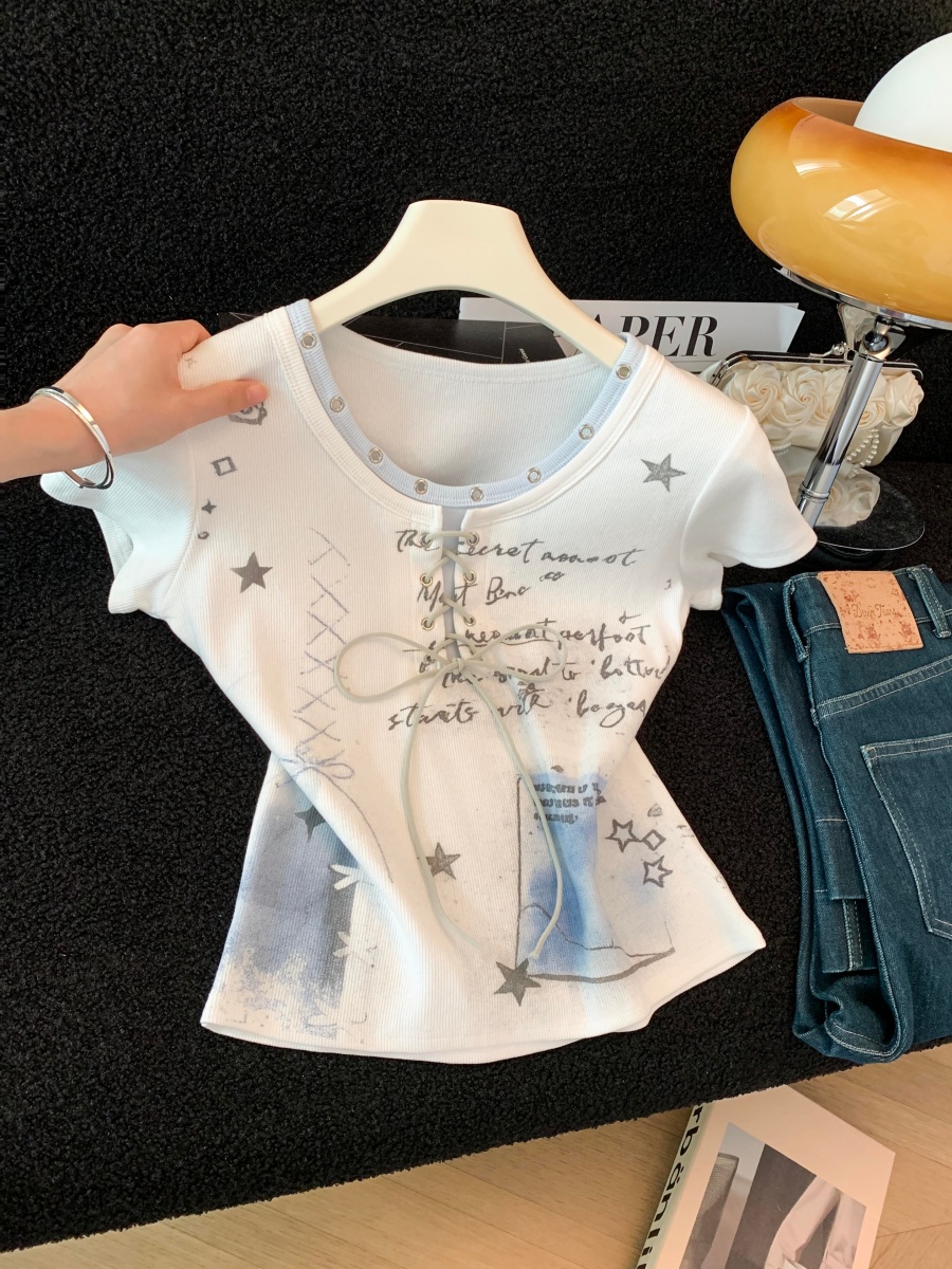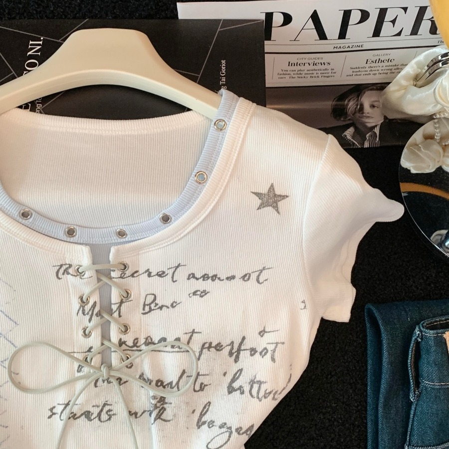 BY17772# 夏季甜美少女风V领绑带短袖T恤女星星印花显瘦上衣 服裝批發女裝批發服飾貨源