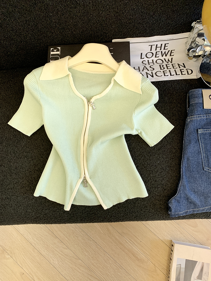BY17935# 撞色翻领双拉链开衫上衣女夏季新款显瘦短袖针织T恤潮 服裝批發女裝批發服飾貨源