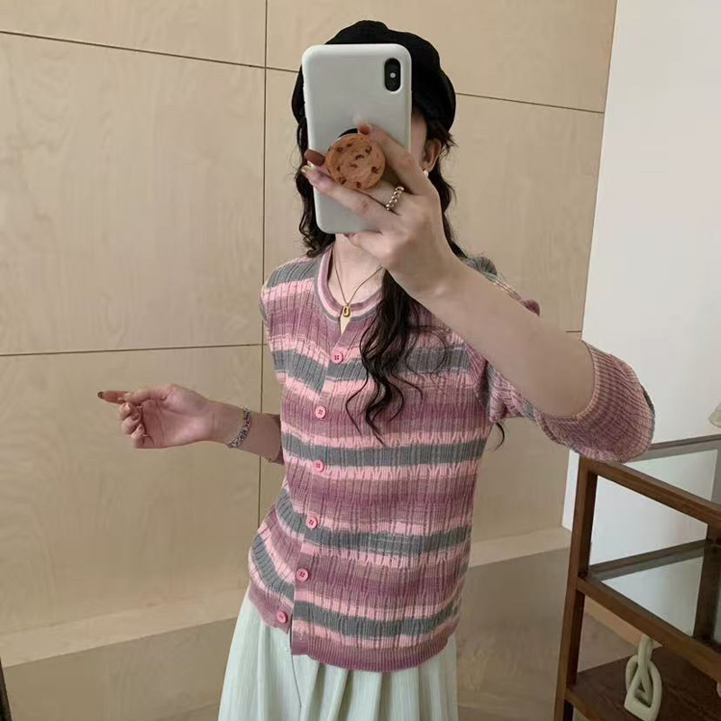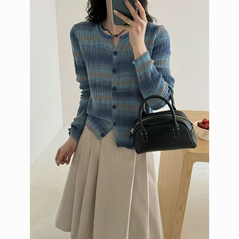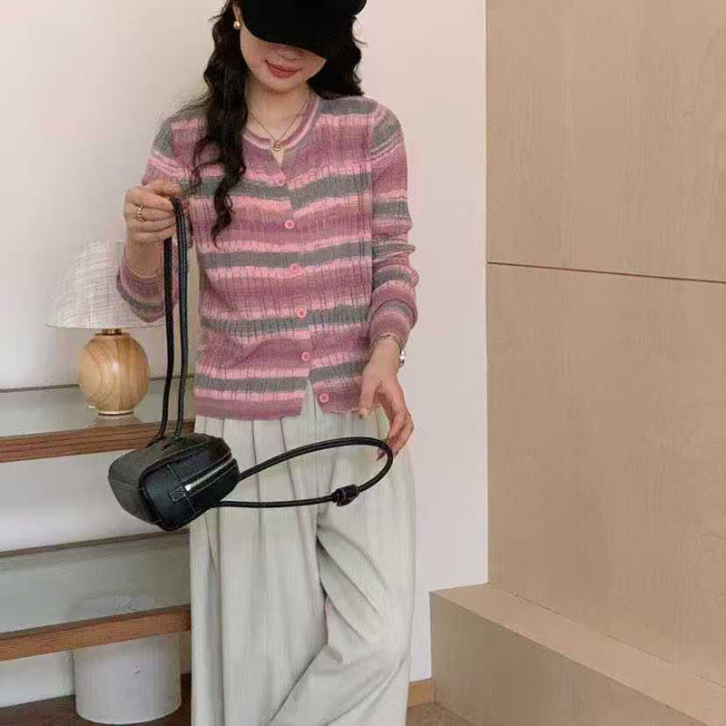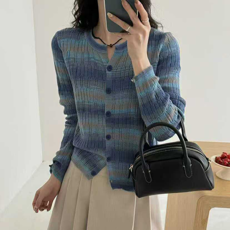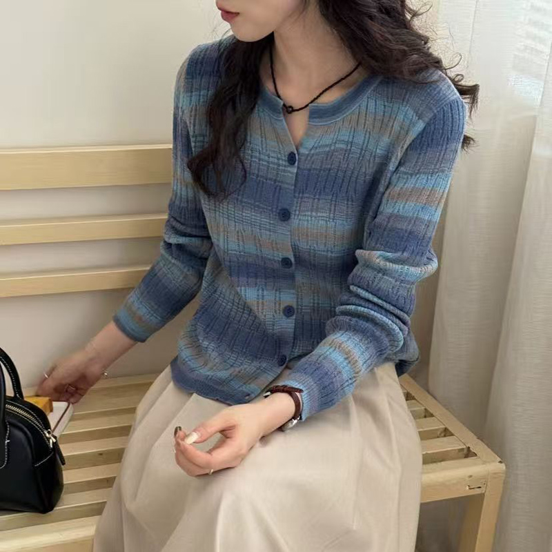 YF5906# 秋冬彩虹提花编织圆领长袖排扣镂空薄款别致针织上衣 服裝批發女裝批發服飾貨源