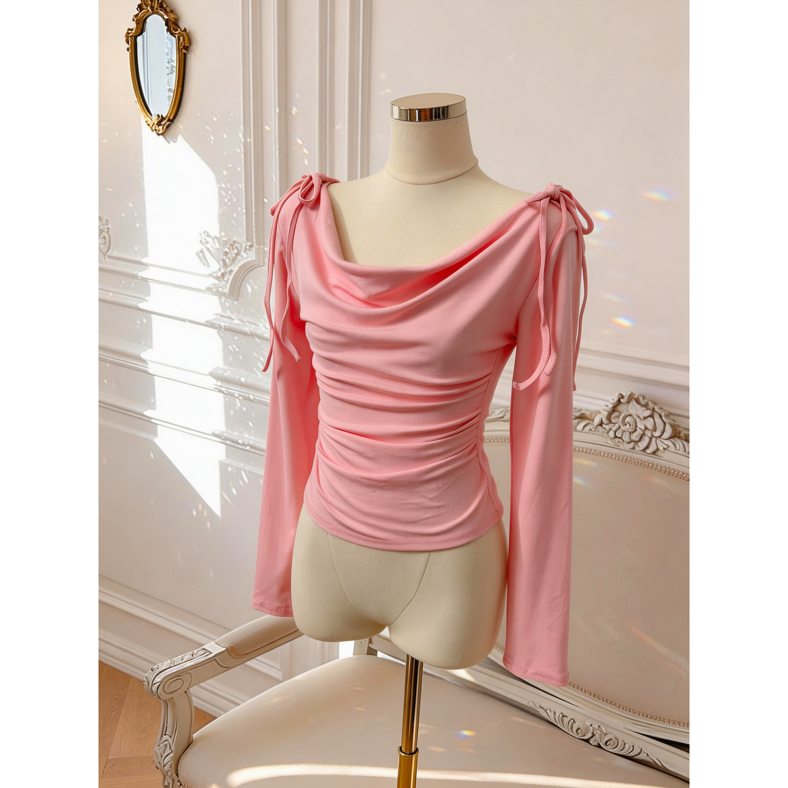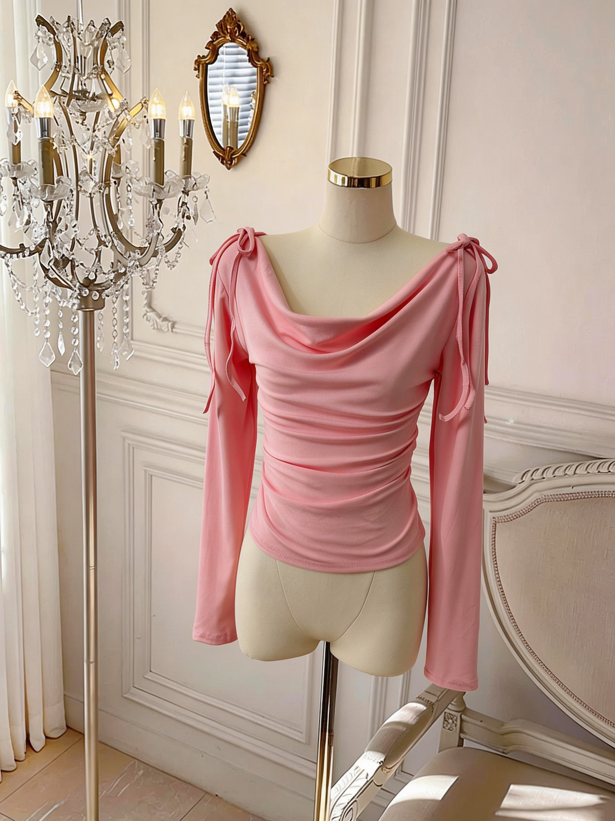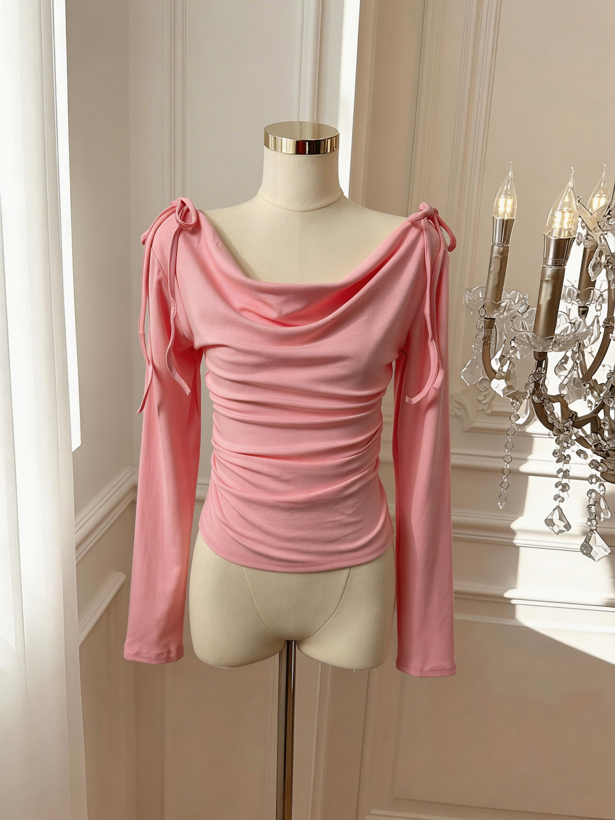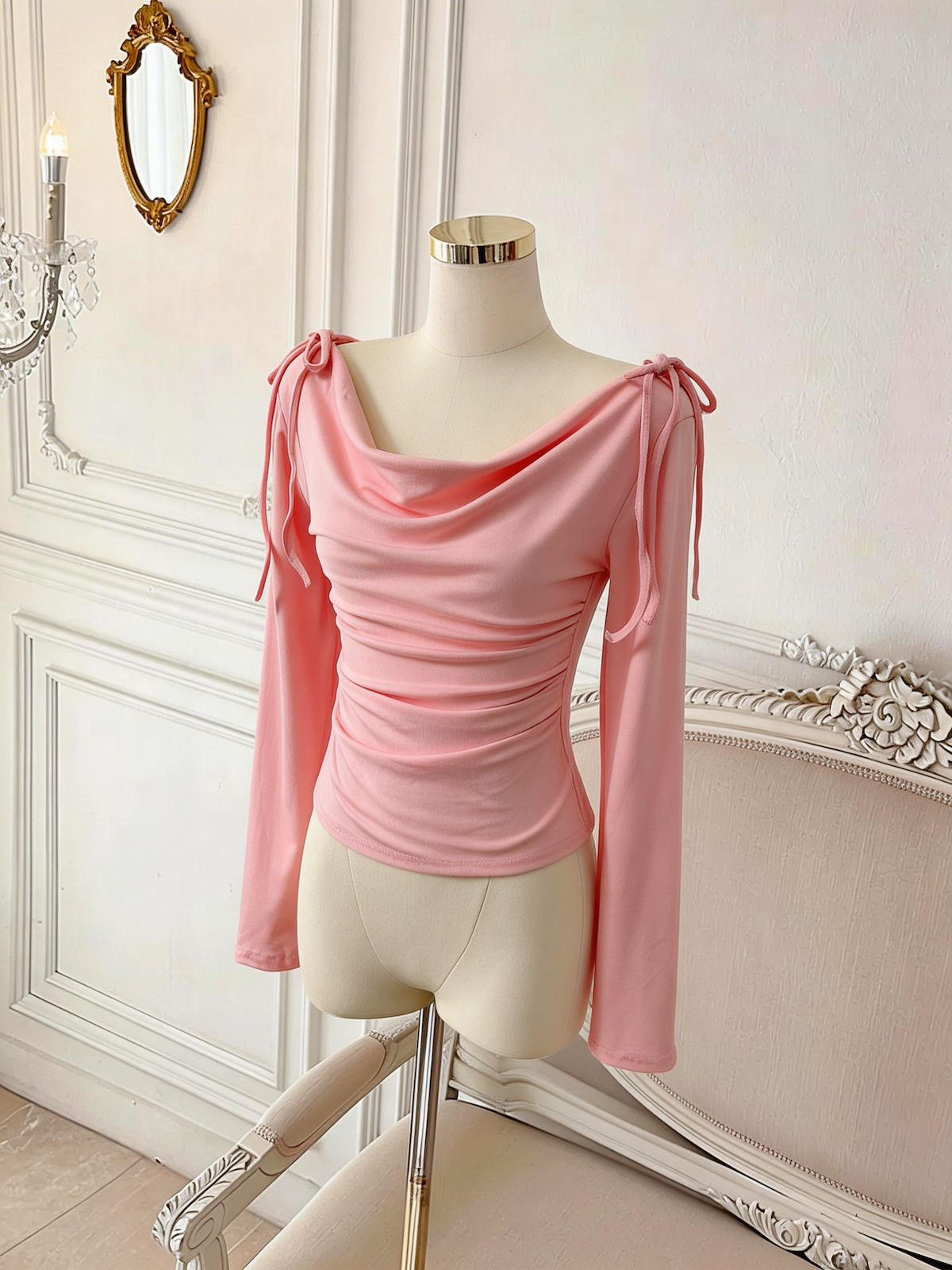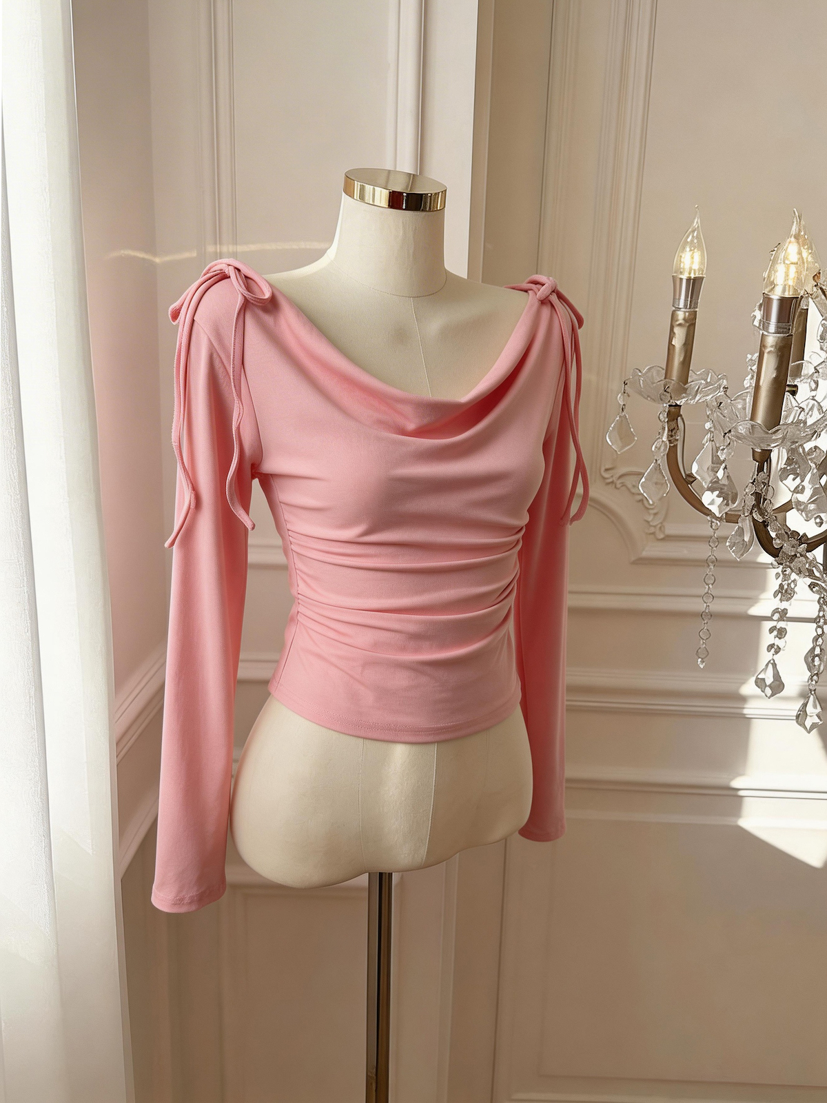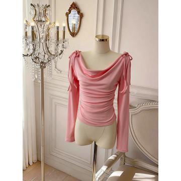 BY10880# 春日韩味荡领上衣女百搭春季收腰褶皱长袖T恤 服裝批發女裝批發服飾貨源