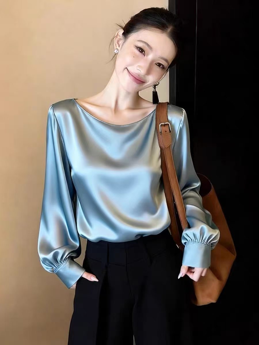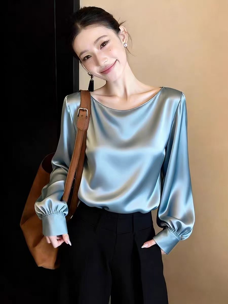 今年流行漂亮高级感超好看上衣别致独特减龄蓝色高端缎面衬衫女春 服裝批發女裝批發服飾貨源