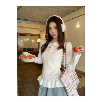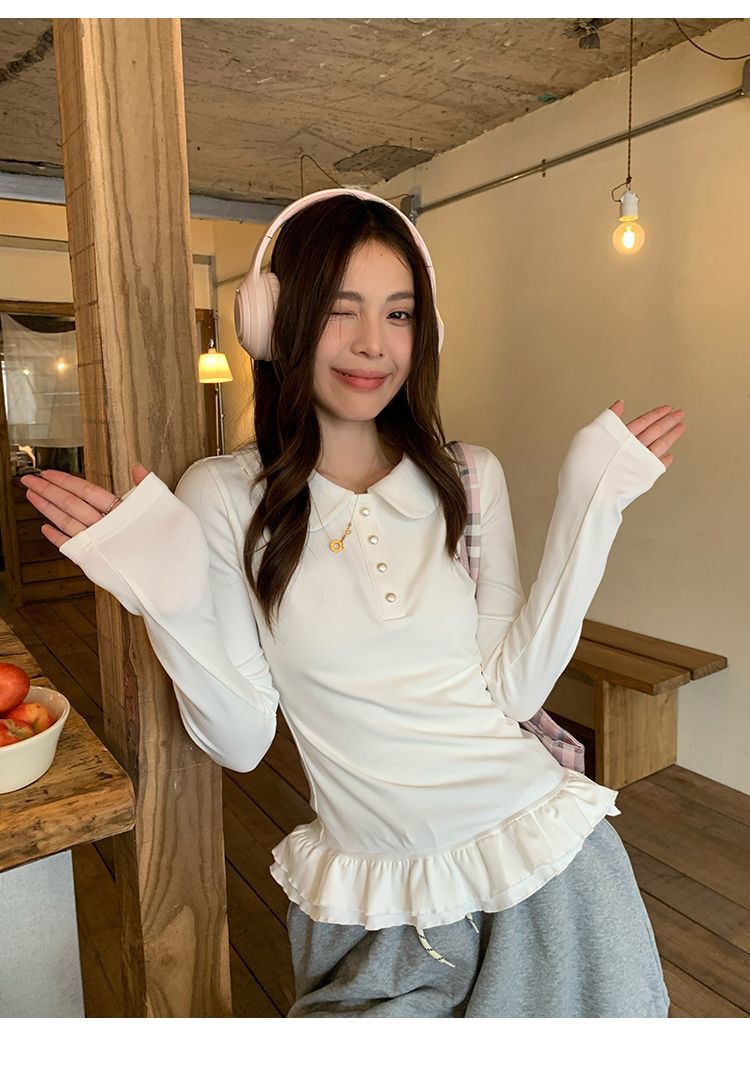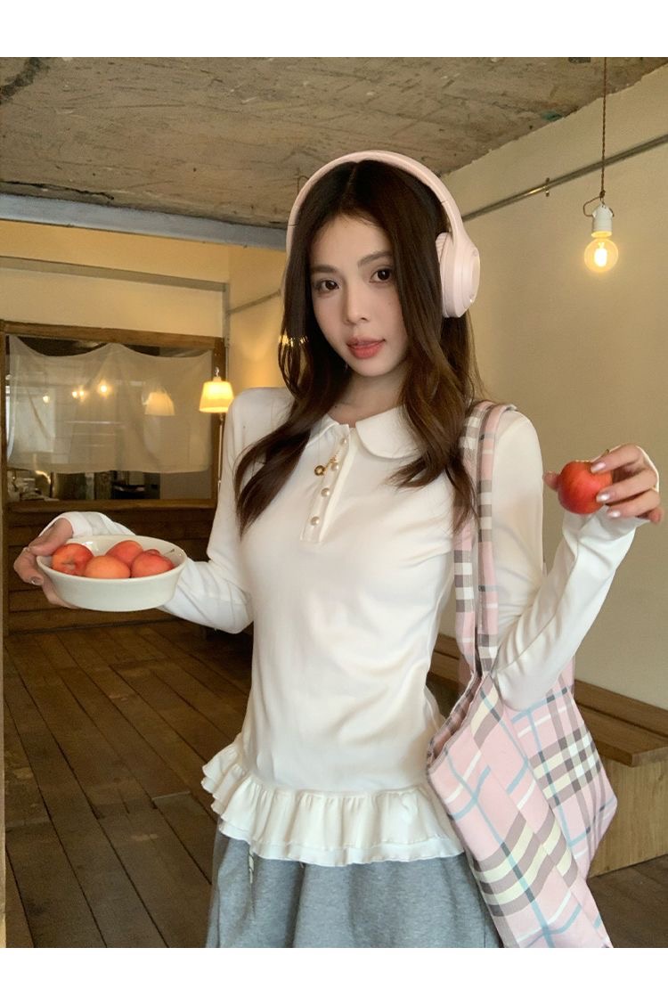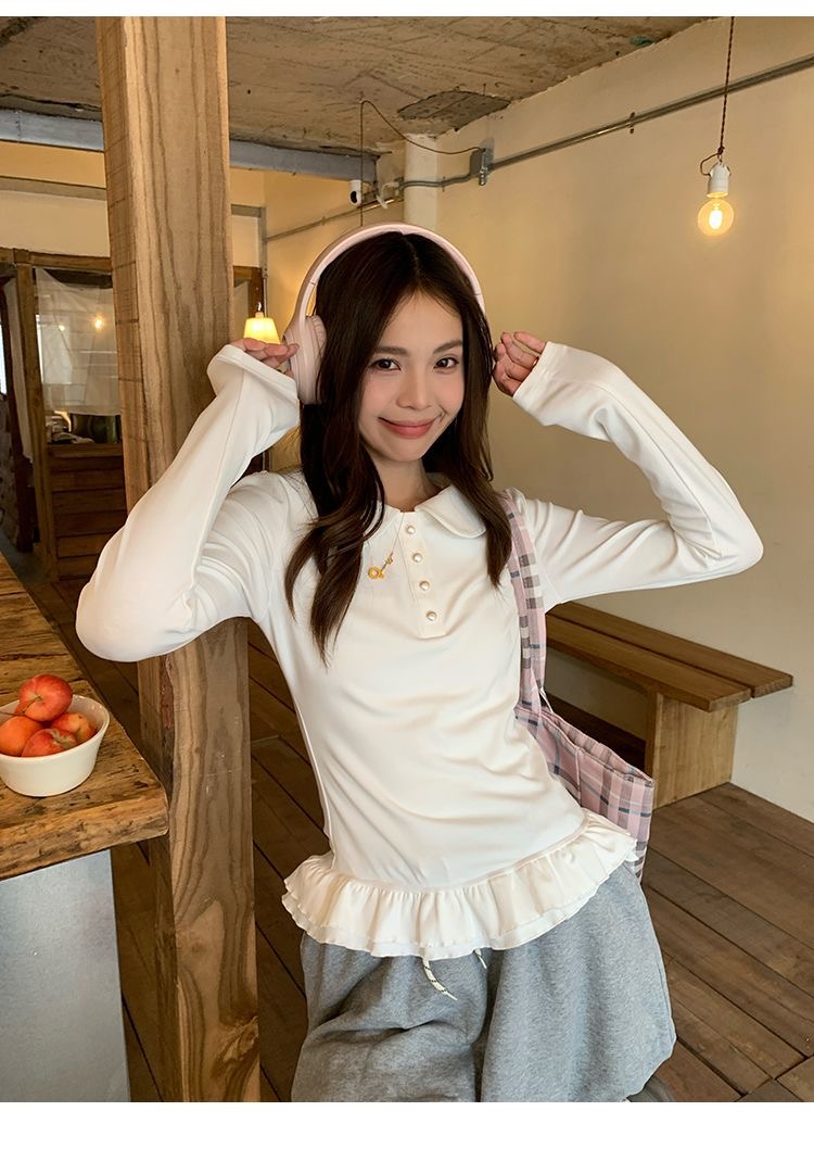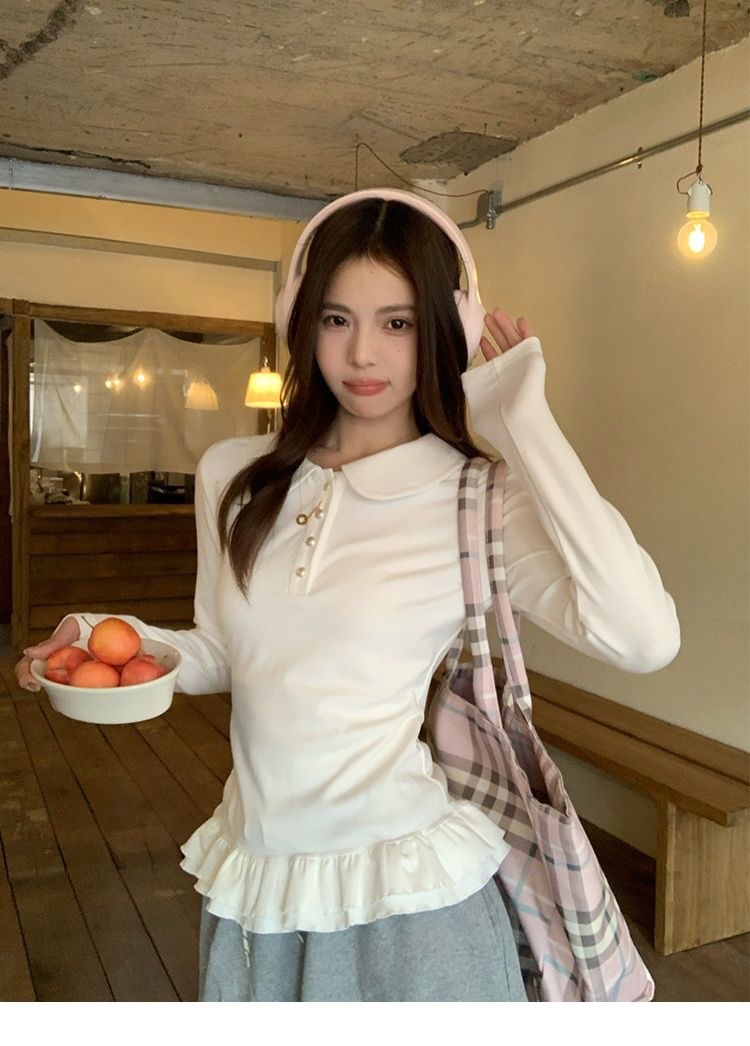 花边下摆娃娃领纽扣长袖内搭T恤女修身衣女 服裝批發女裝批發服飾貨源