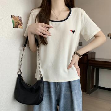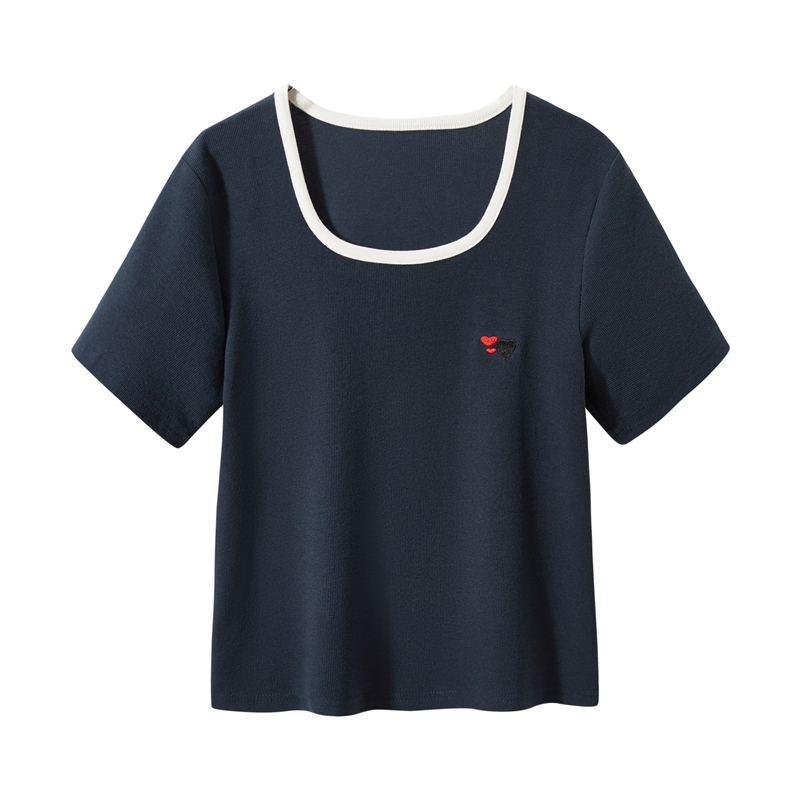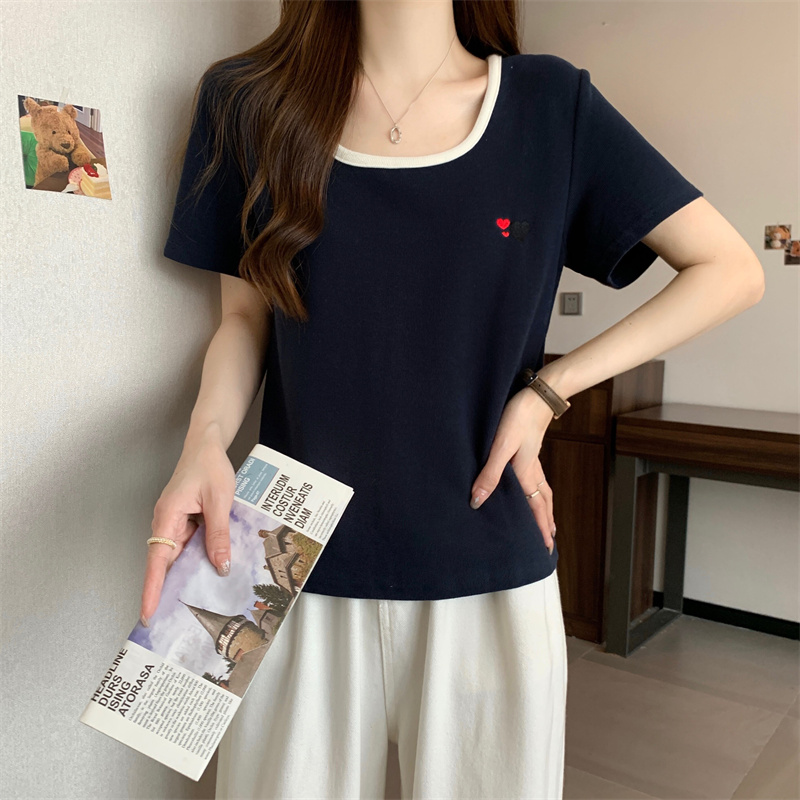 福利款设计感爱心刺绣上衣夏小个子显瘦方领短袖正肩T恤 服裝批發女裝批發服飾貨源